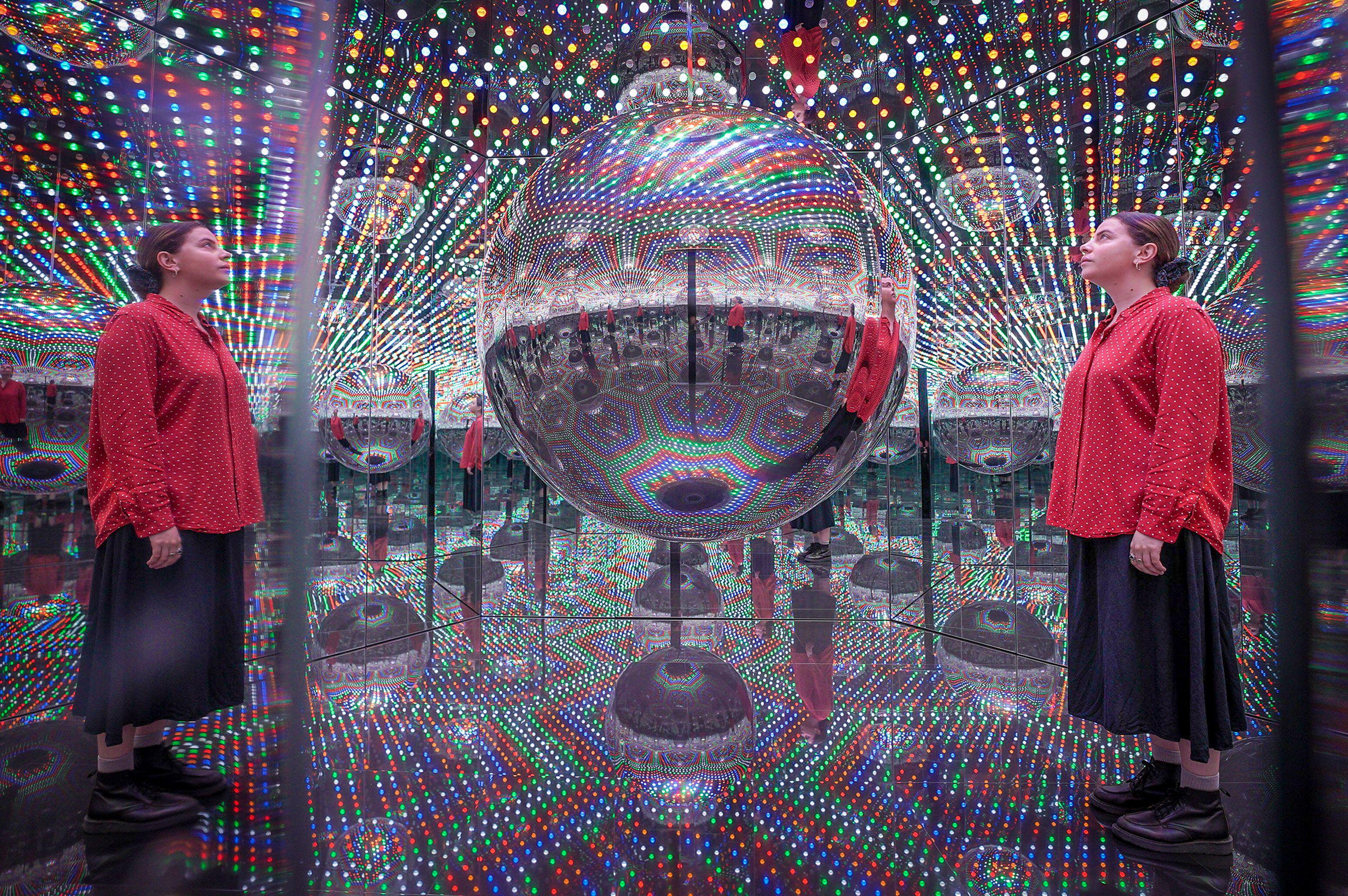 A woman visits Infinity Mirror Room, the latest of a series of installations by Yayoi Kusama in London on September 23, 2024. Every Day I Pray for Love is the Japanese artist’s 14th solo exhibition at the Victoria Miro gallery. (Photo by Guy Corbishley/Alamy Live News)