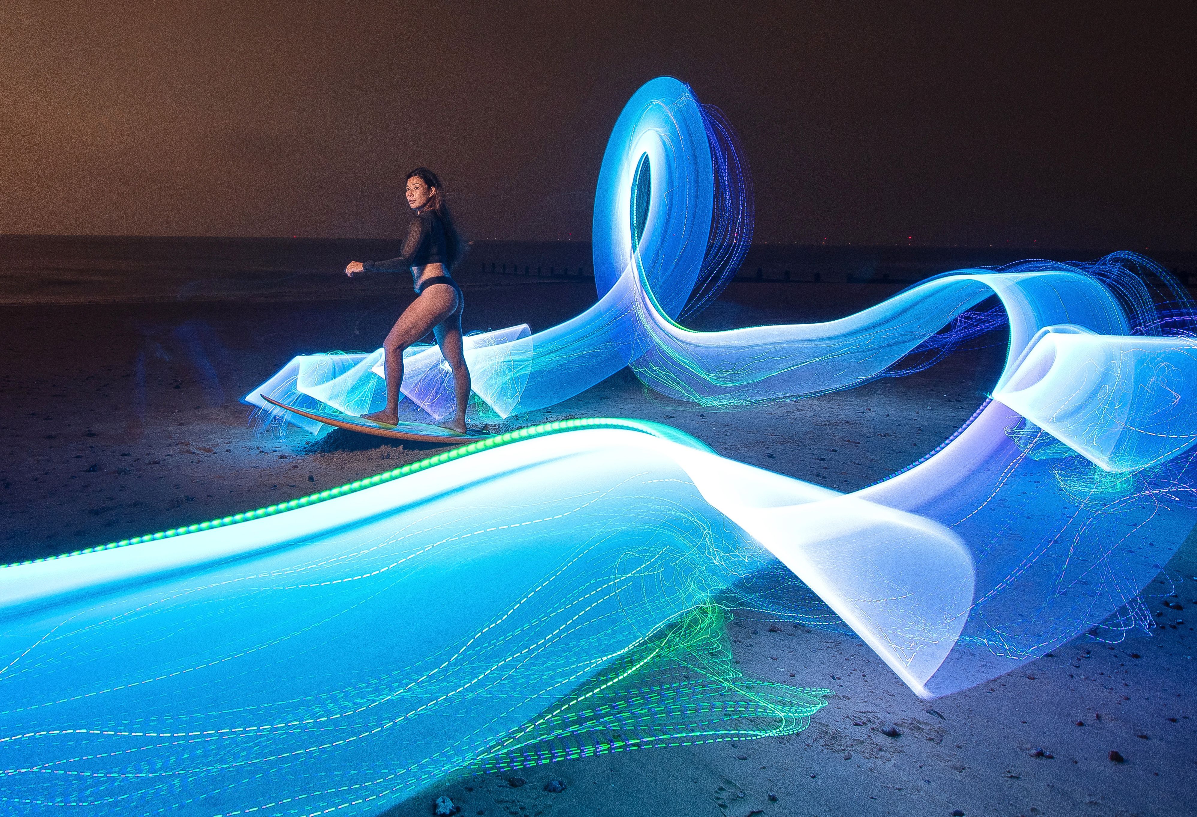 Jess Ashley poses with a surfboard on the beach at Frinton-on-Sea on Essex, UK as coloured LED lights are moved to create a light painting during a 11-second exposure on September 27, 2024. (Photo by Kevin Jay/Picture Exclusive)