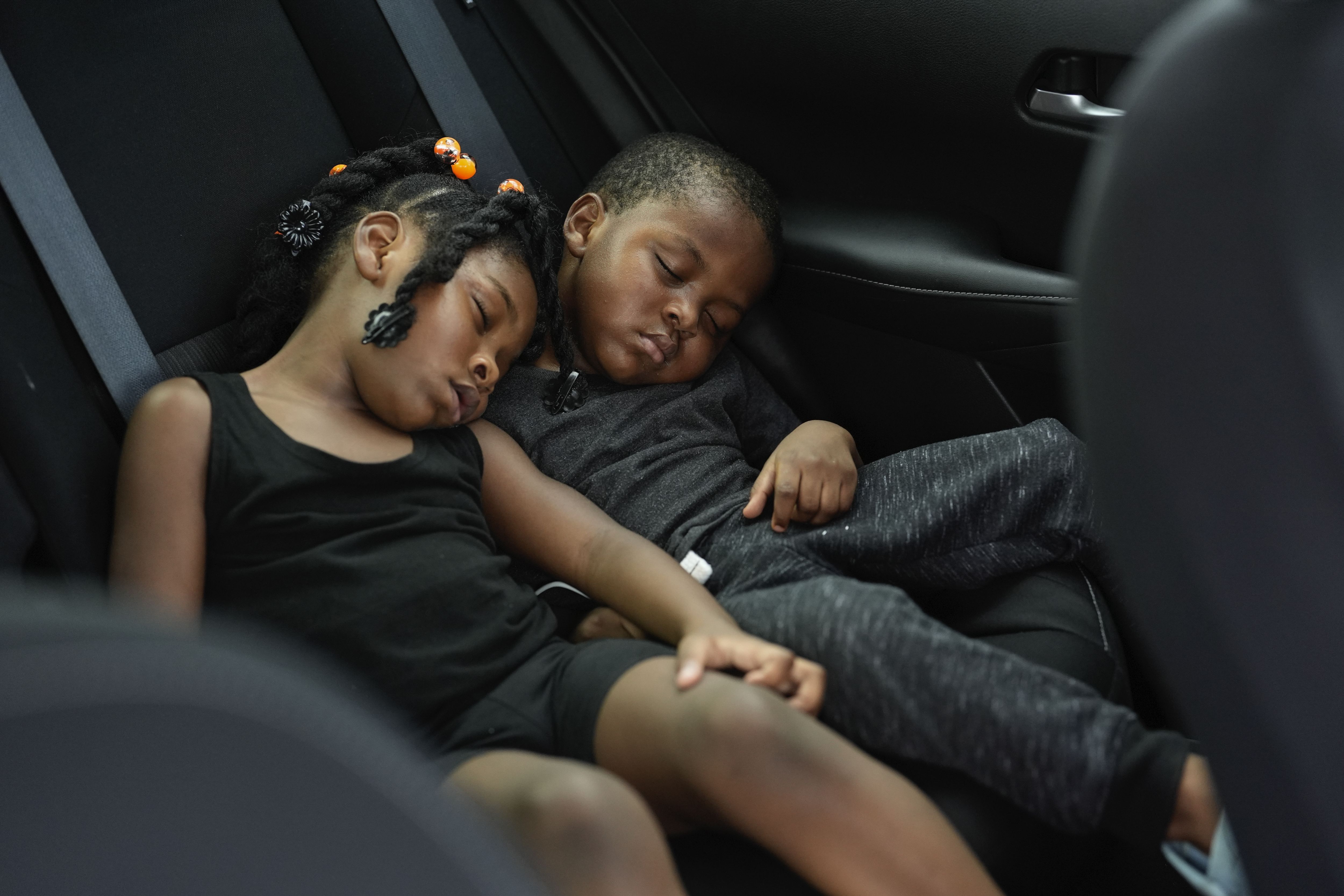 Siblings Saboria, 4, left, and Messiah Tyler, 3, nap in the backseat of a car after the roof was torn off the home where they lived with their mom, grandparents, an aunt and an uncle during the passage of Hurricane Milton, in Palmetto, Fla., Thursday, October 10, 2024. (Photo by Rebecca Blackwell/AP Photo)