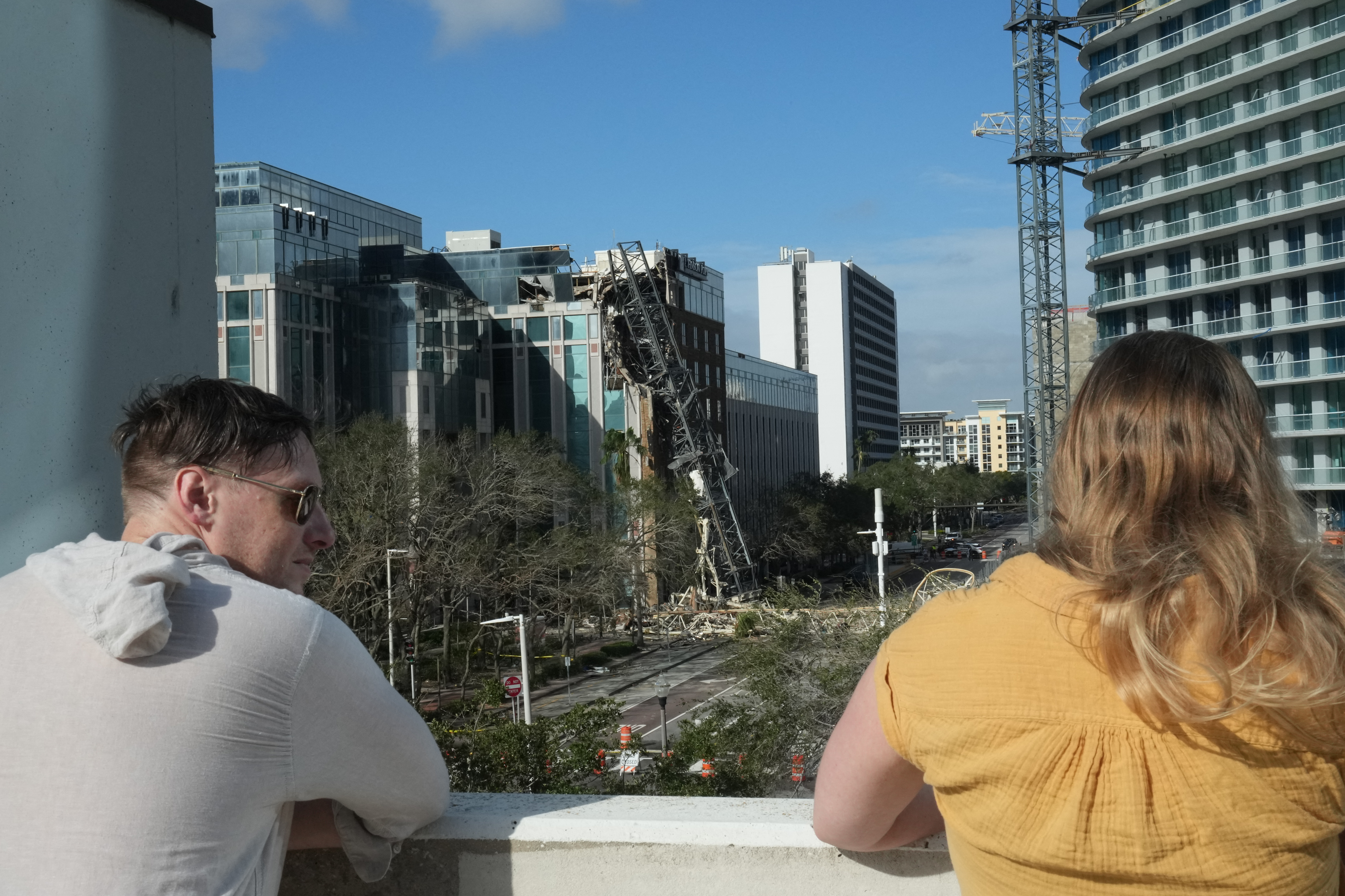Residents look over a crane that collapsed into a building in downtown St. Petersburg due to Hurricane Milton on October 10, 2024 in Florida. At least four people were confirmed killed as a result of two tornadoes triggered by Hurricane Milton on the east coast of the US state of Florida, local authorities said Thursday. (Photo by Bryan R. Smith/AFP Photo)