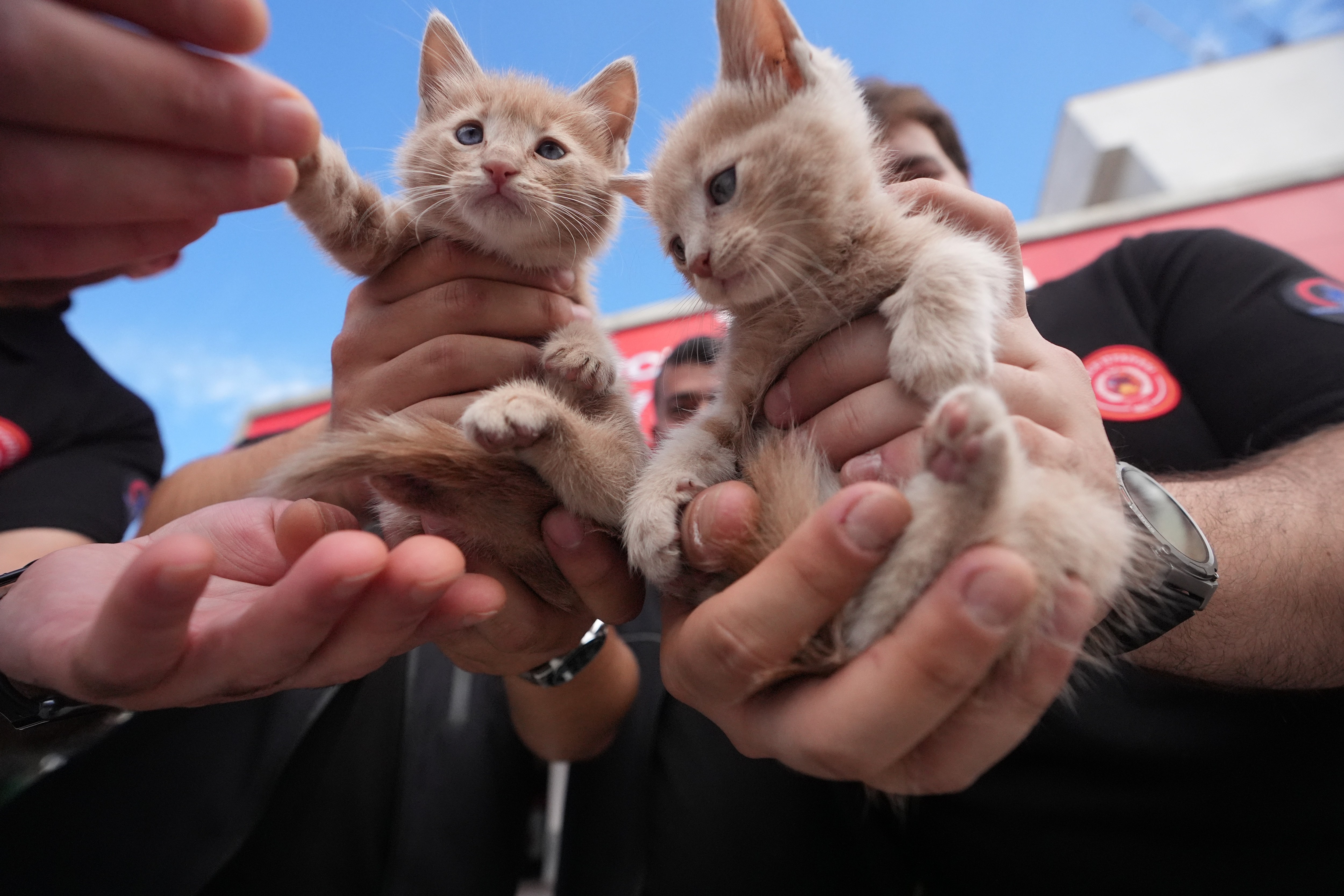 A view of two kittens named “Duman” and “Alev” who were rescued from an engine compartment of the vehicle by the fire brigade driver Huseyin Gedikli, who then adopted the kittens and brought them to his workplace in Duzce, Turkiye on October 11, 2024. (Photo by Omer Urer/Anadolu via Getty Images)