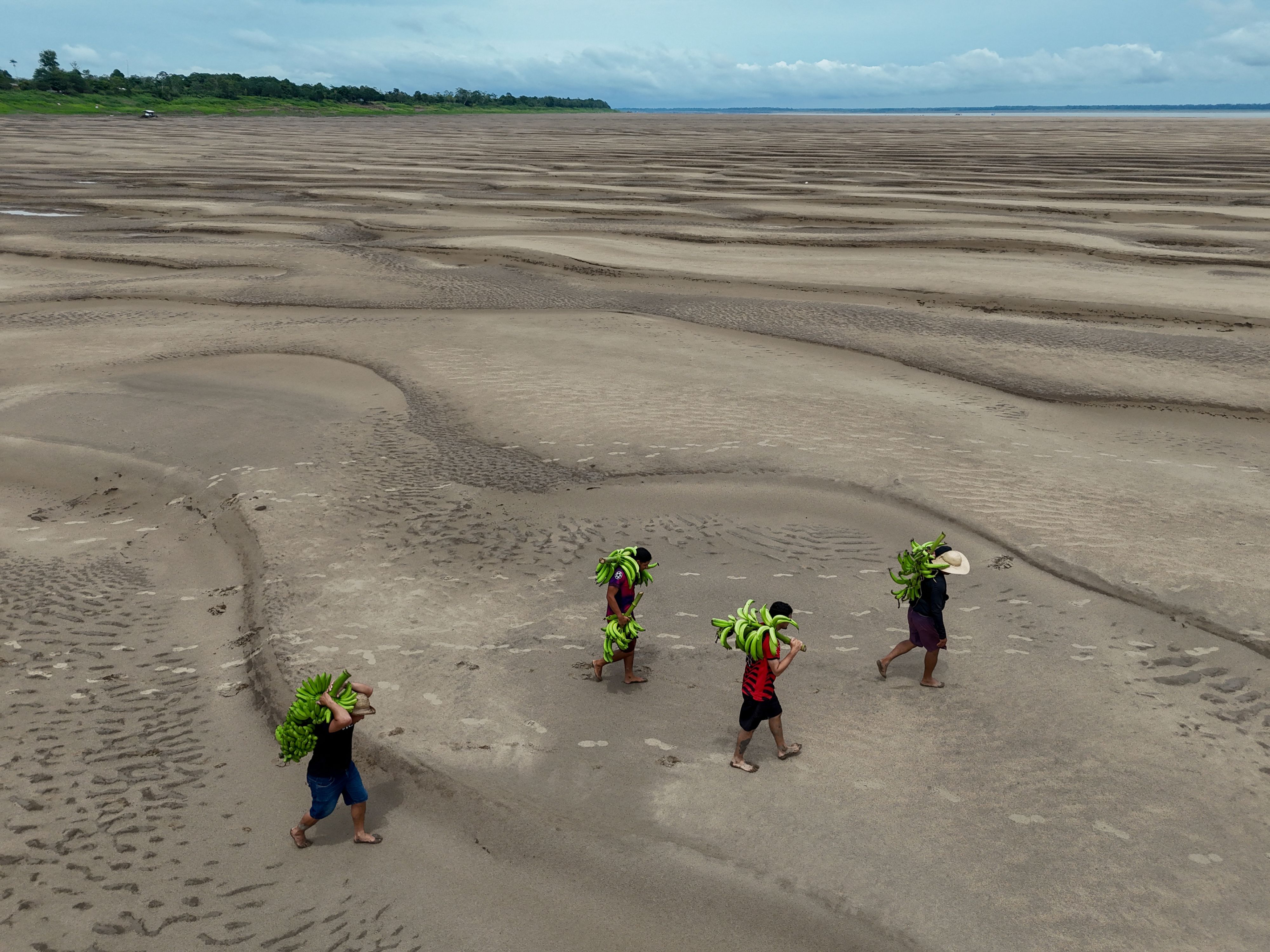 Aerial view of riverbank dwellers carrying banana produce over the dry Solimoes riverbed in the Pesqueiro community in Manacapuru, Amazonas state, northern Brazil, on September 30, 2024. (Photo by Michael Dantas/AFP Photo)