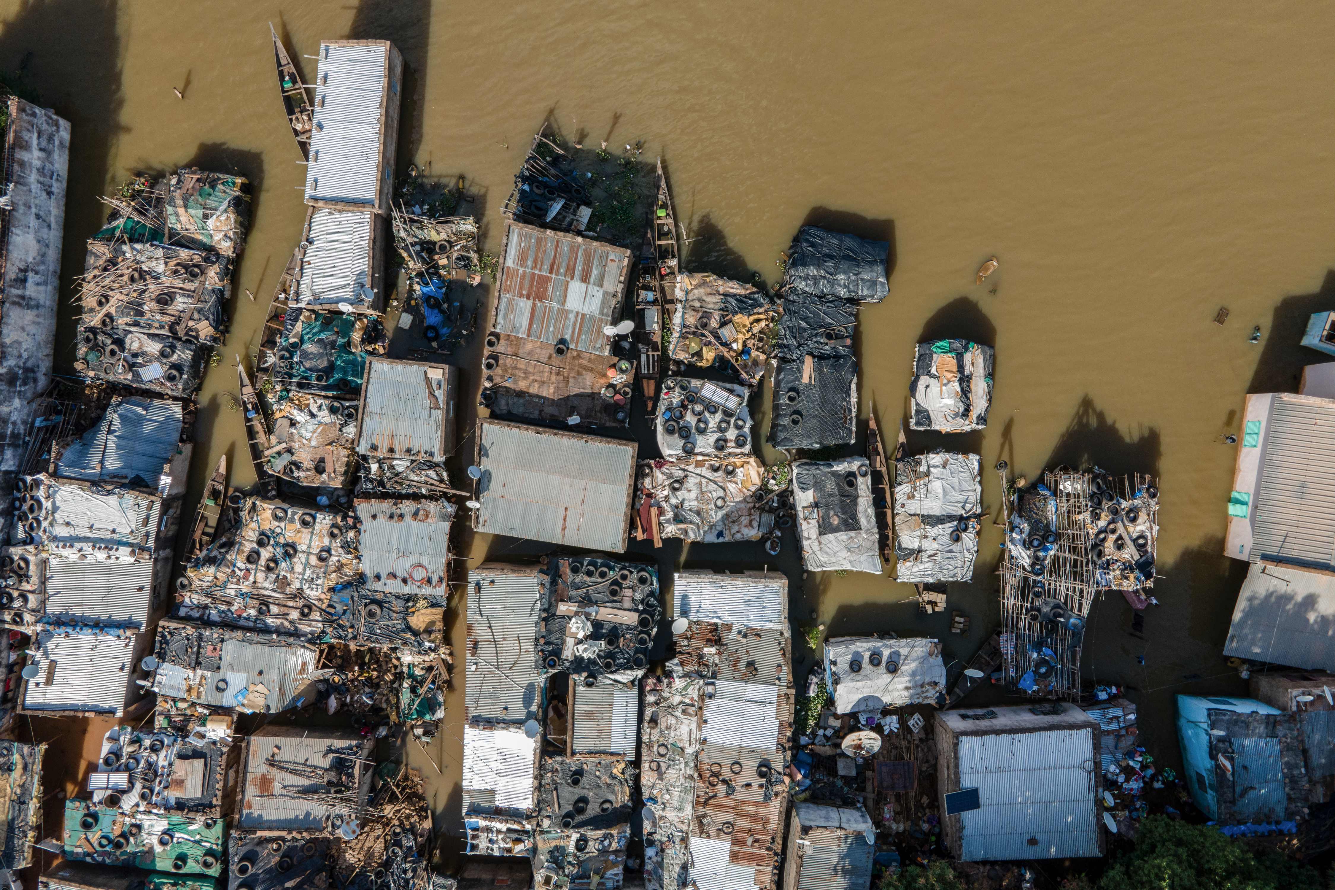 This areal view shows houses submerged in water in the flooded area of the Badalabougou district in Bamako on October 3, 2024. Heavy rains have recently led to severe flooding across the Sahel, affecting people in multiple countries. (Photo by Ousmane Makaveli/AFP Photo)