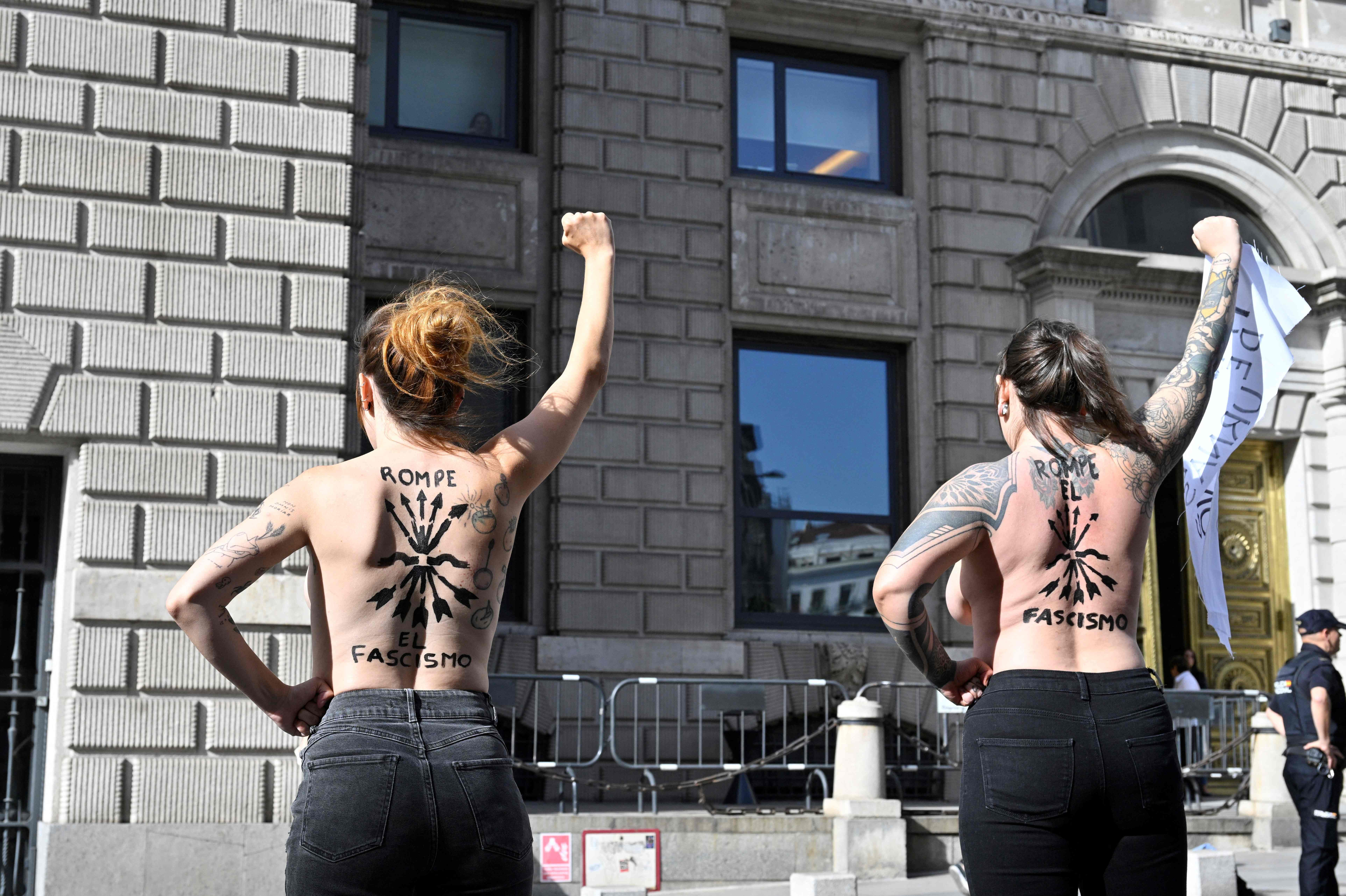 Femen activists protest in front of the Electoral Commission in Madrid on July 11, 2023 against the use by Spain's fascist Falange party of the fascist hymn “Cara al Sol” in its electoral campaign, ahead of July 23 general election. (Photo by Javier Soriano/AFP Photo)