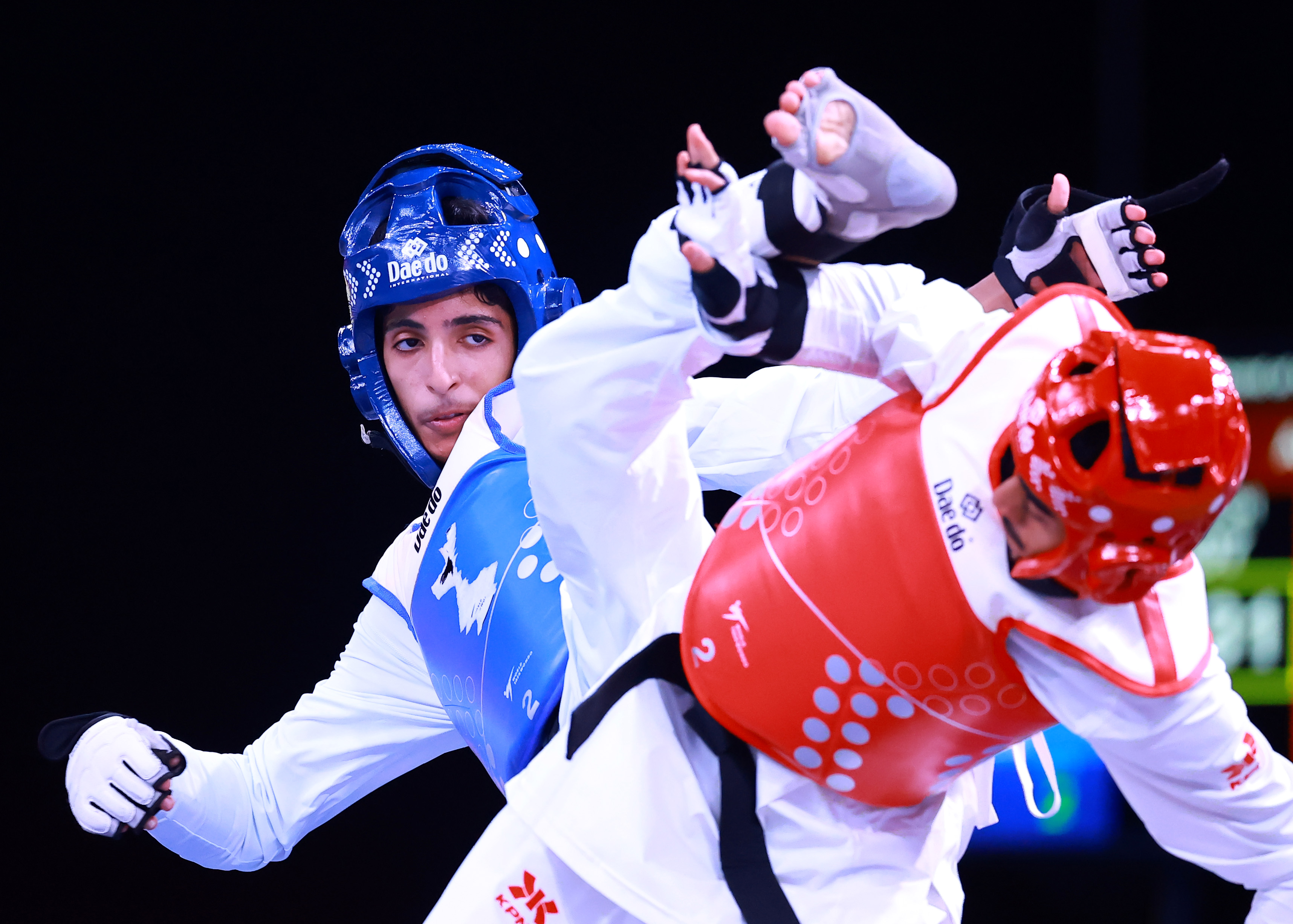 Nasser Al Dhuwayyan of Team AlUla (L)competes against Abdullah Almushraf of Team Al Shabab in the Youth Men's Taekwondo -48kg Round of 16 Bout on day twelve of the Saudi Games 2024 on October 14, 2024 in Riyadh, Saudi Arabia. The Saudi Games is a multi-game combined sports tournament and the largest national sporting event held annually in the Kingdom. (Photo by Hector Vivas/Getty Images for Saudi Games)