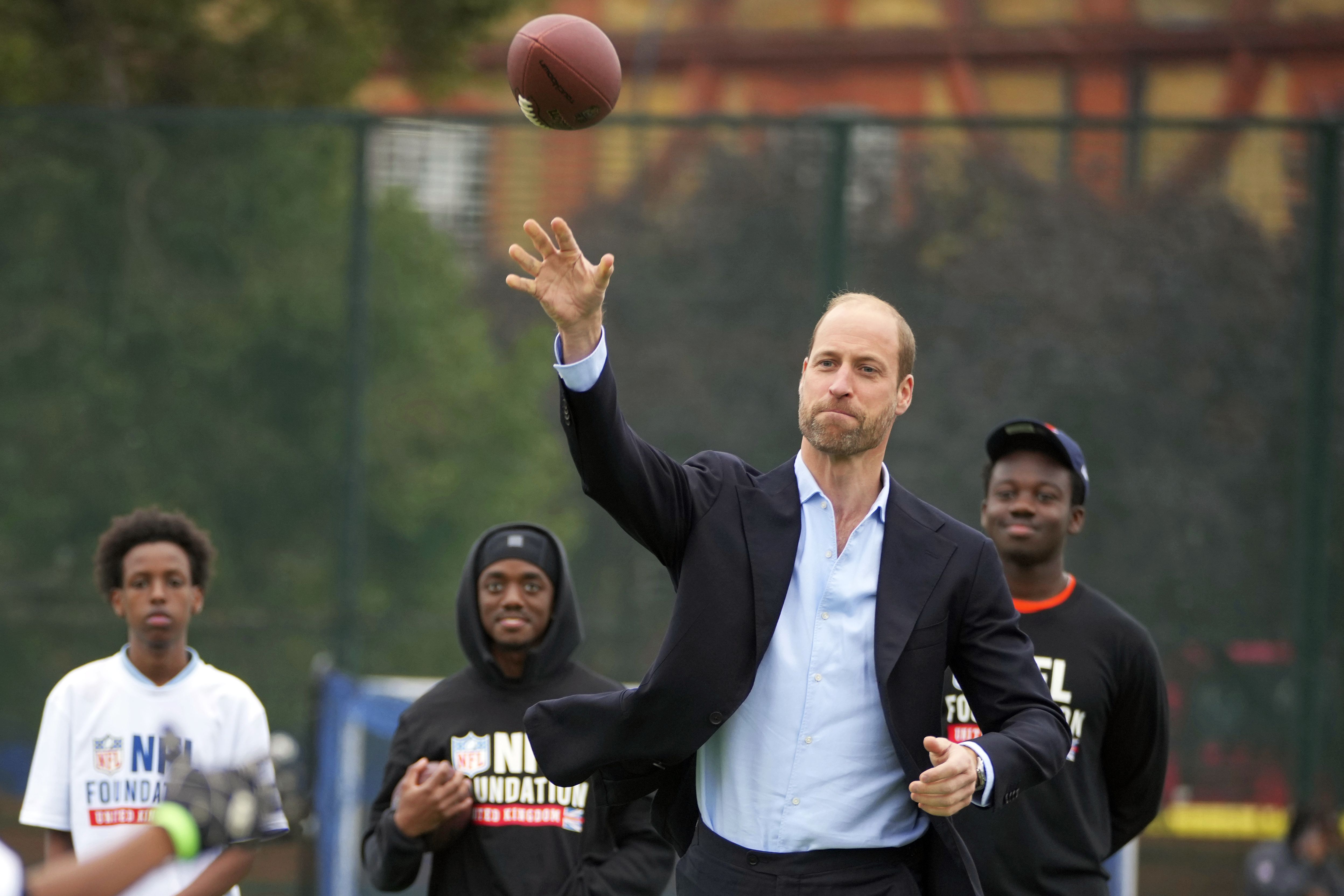 Britain's Prince William throws a football as he attends a NFL Foundation NFL Flag event, an inclusive and fast paced American Football format, in London, Tuesday, October 15, 2024. (Photo by Kin Cheung, Pool/AP Photo)