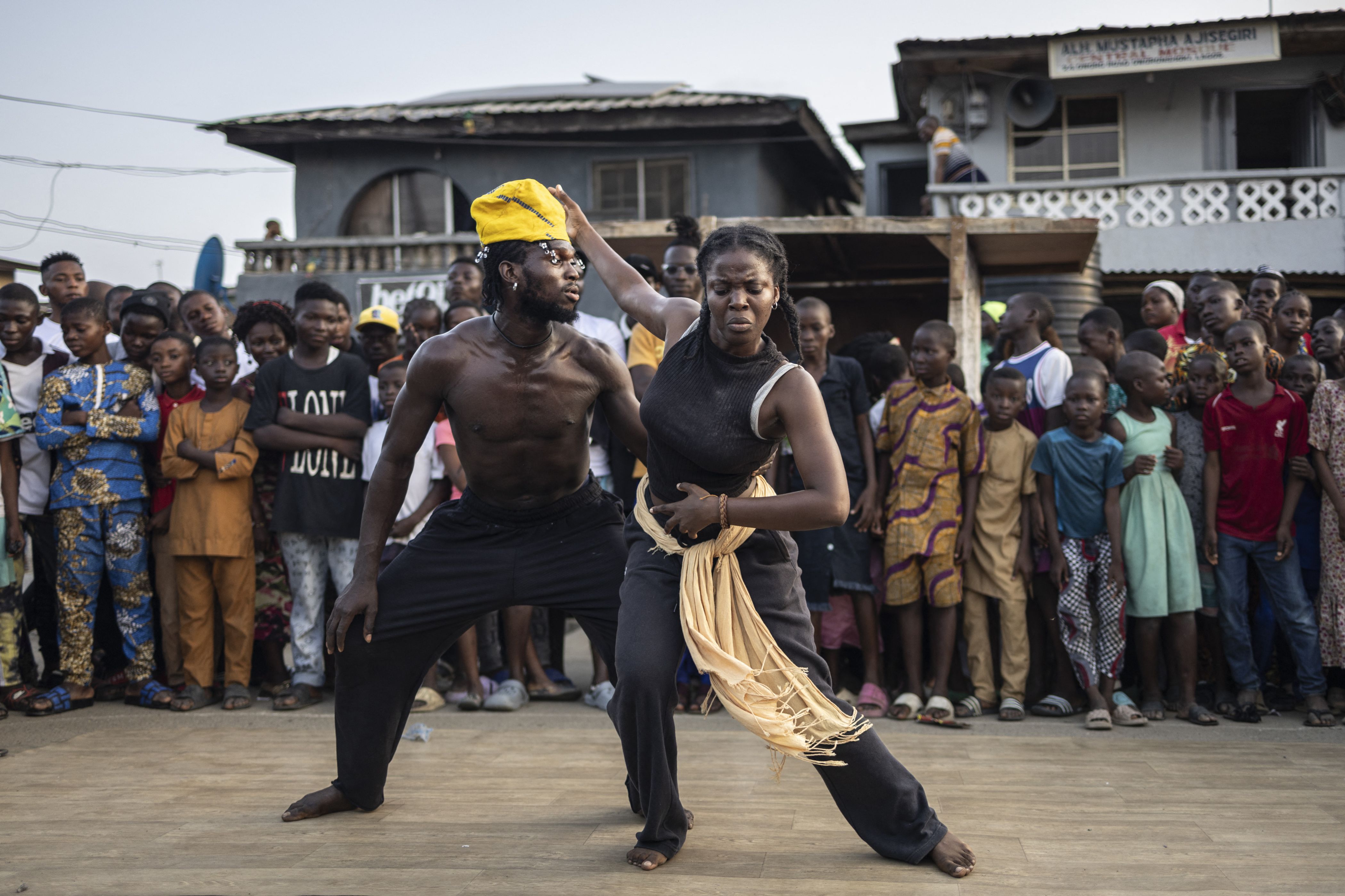 A professional artist performs during “Slum Party” a dance festival in the Oworoshoki district on mainland Lagos, Nigeria on September 29, 2024. (Photo by Olympia de Maismont/AFP Photo)