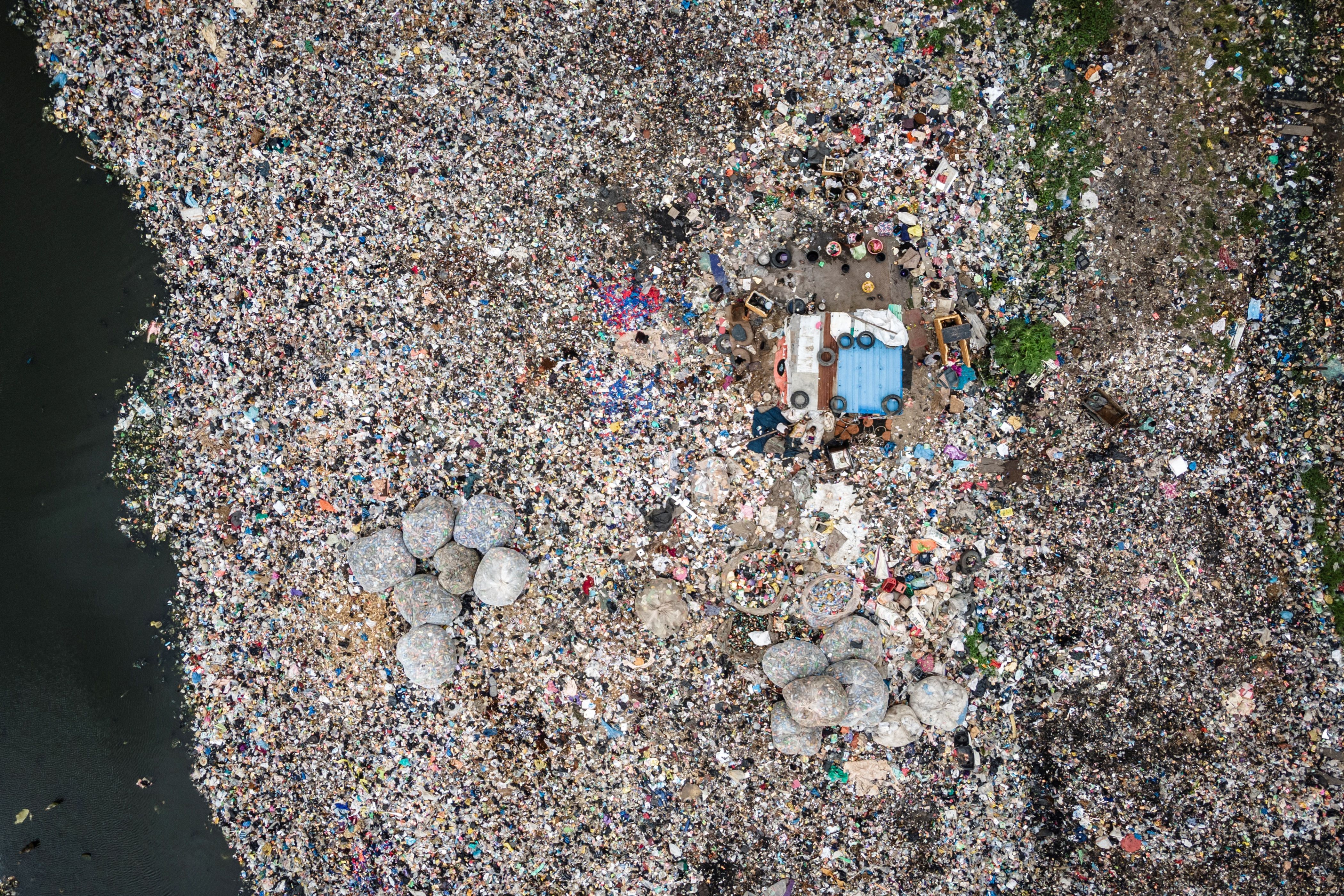 This aerial wiew shows a portion of the waste clogged lagoon along a slum in the Oworoshoki district in mainland Lagos on September 29, 2024. (Photo by Olympia de Maismont/AFP Photo)