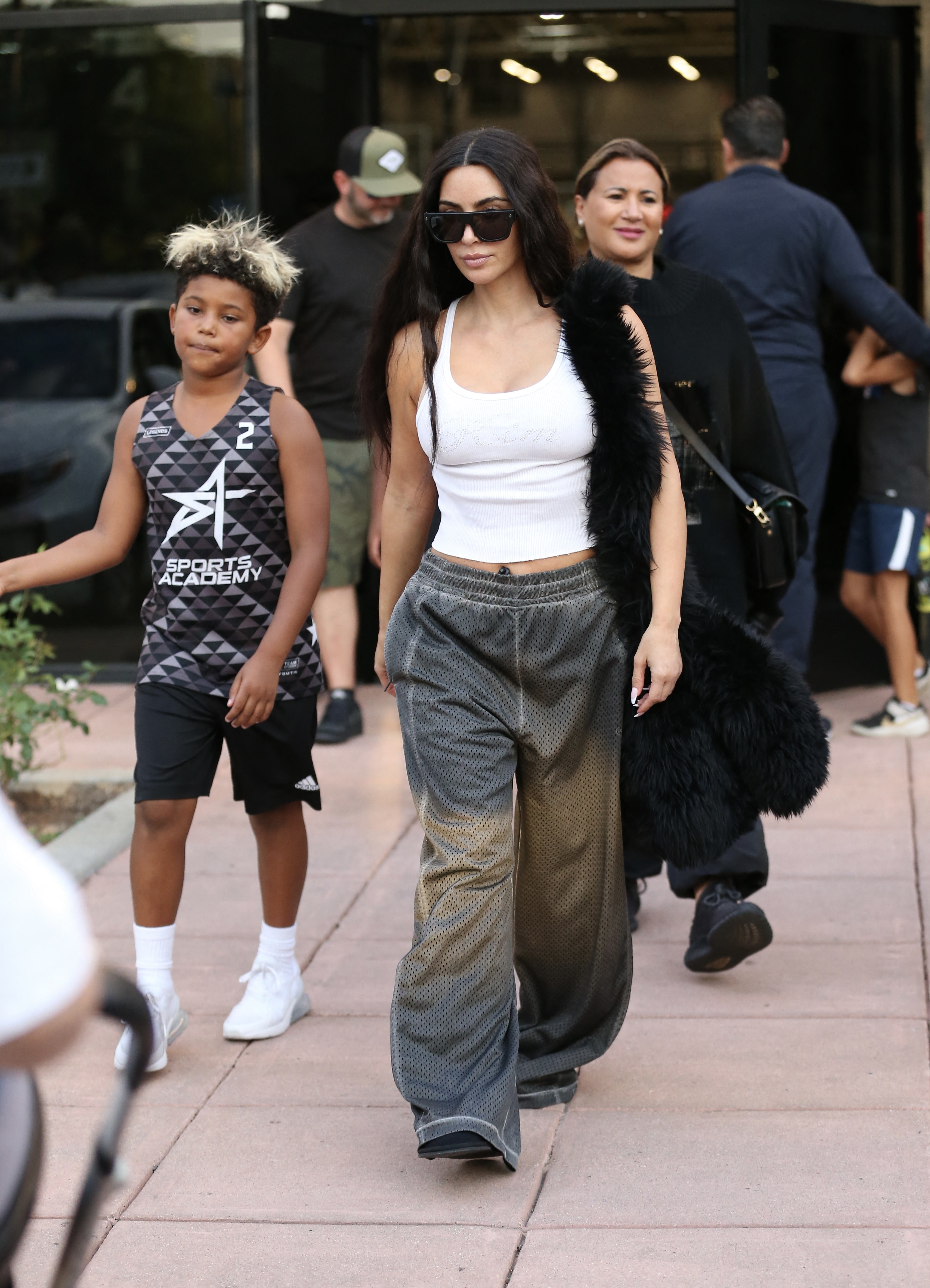 American media personality and socialite Kim Kardashian is seen with her son Saint West as they leave his basketball game on October 4, 2024. (Photo by Thecelebrityfinder/The Mega Agency)
