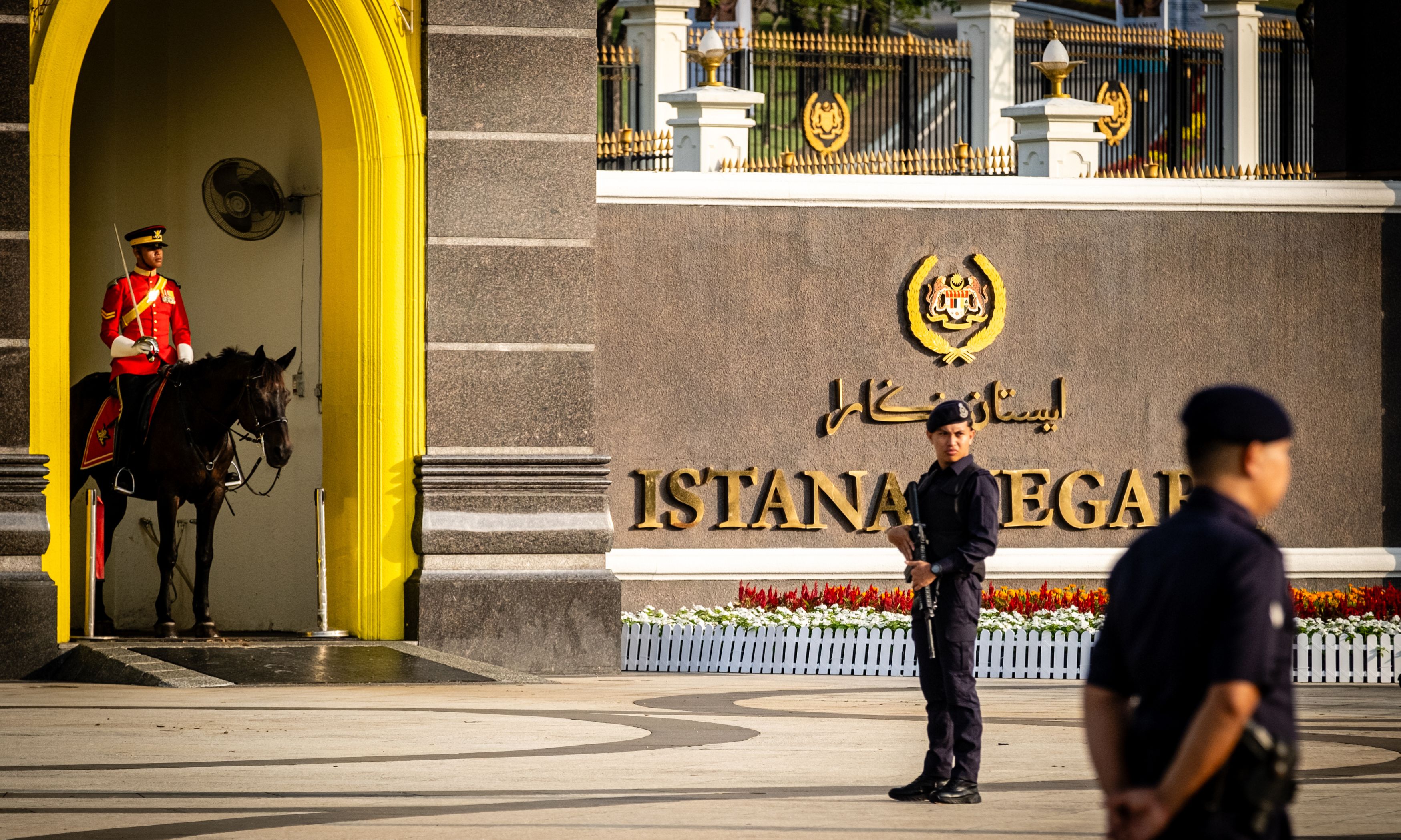 The Equestrian Unit of the Palace Guard is seen standing guard during the arrival of representatives of state dignitaries during the Coronation Day of the Yang Di-Pertuan Agong, Sultan Ibrahim ibni Sultan Iskandar at the National Palace, Kuala Lumpur, Malaysia on July 20, 2024. Sultan Ibrahim is the ruler of modern Johor, ascending to the throne following the death of his father, Sultan Iskandar, in 2010, and has been officially installed as the 17th Agong starting from 31 January 2024 for five years. (Photo by Syaiful Redzuan/Anadolu via Getty Images)