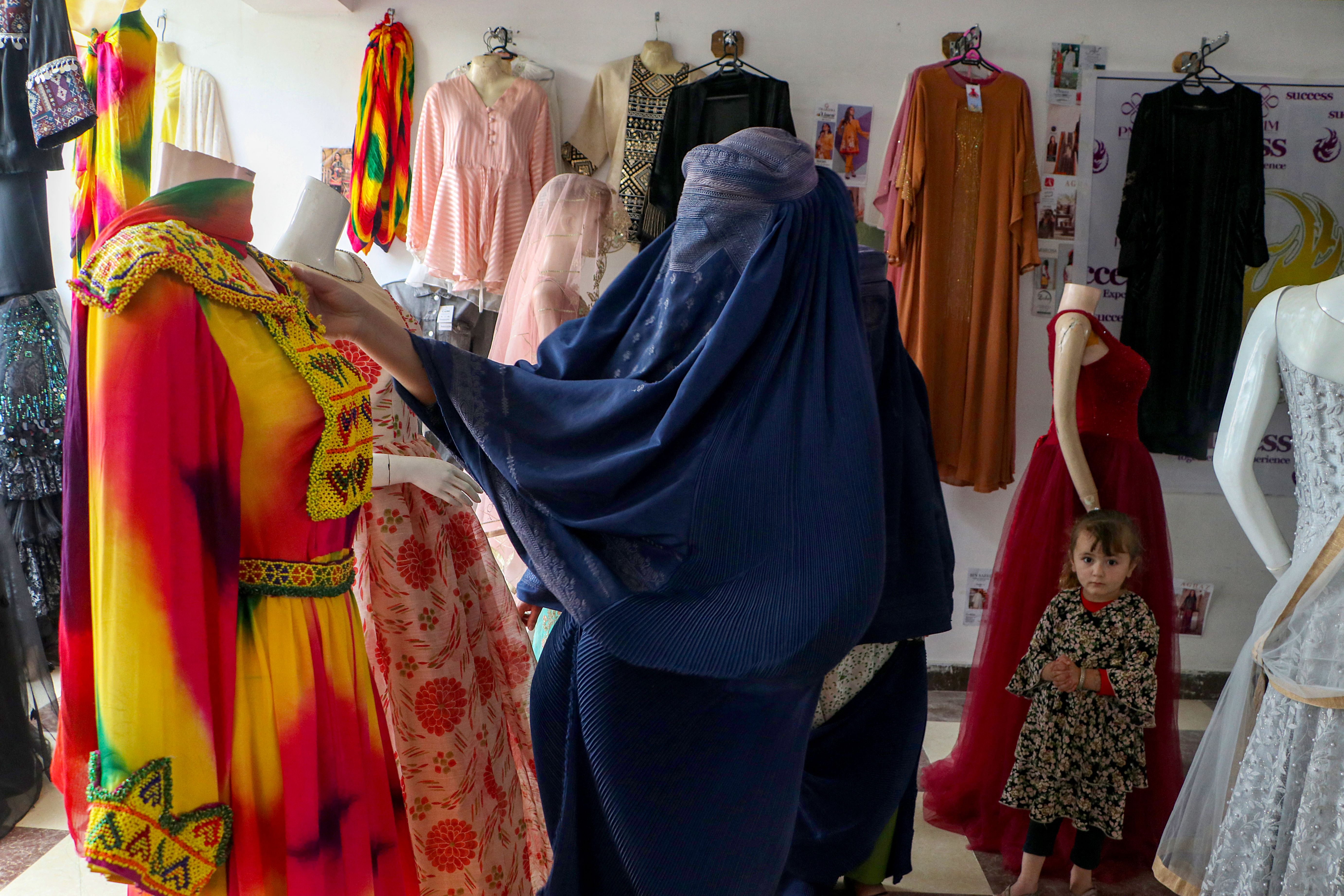 An Afghan burqa-clad woman checks a dress at a shop in Fayzabad district of Badakhshan province on October 16, 2023. (Photo by Omer Abrar/AFP Photo)