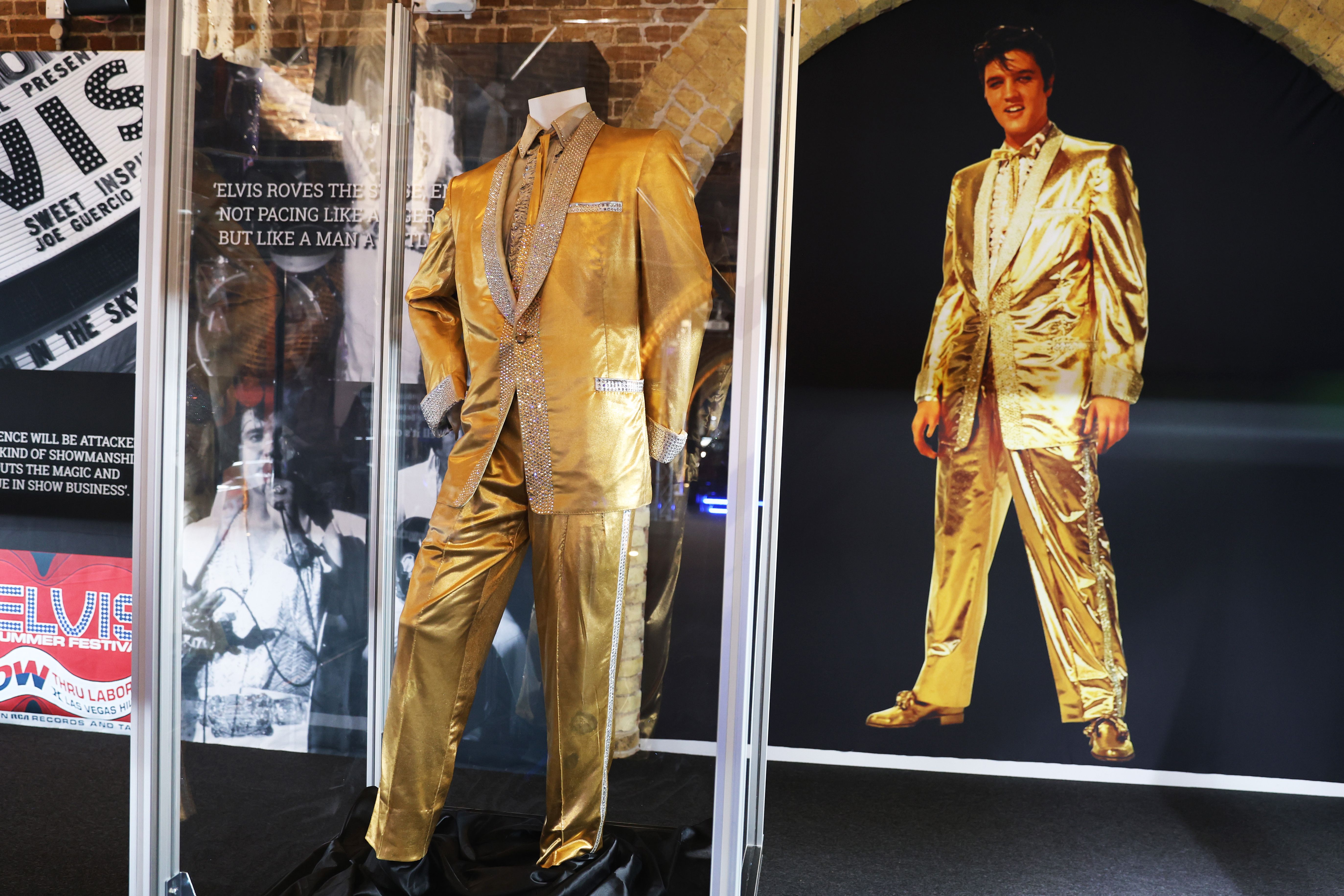 Gold Lame suit worn by Elvis Presley at the Direct from Graceland: Elvis exhibition which is held at the Arches London Bridge on October 19, 2023 in London, England. (Photo by Lia Toby/Getty Images)