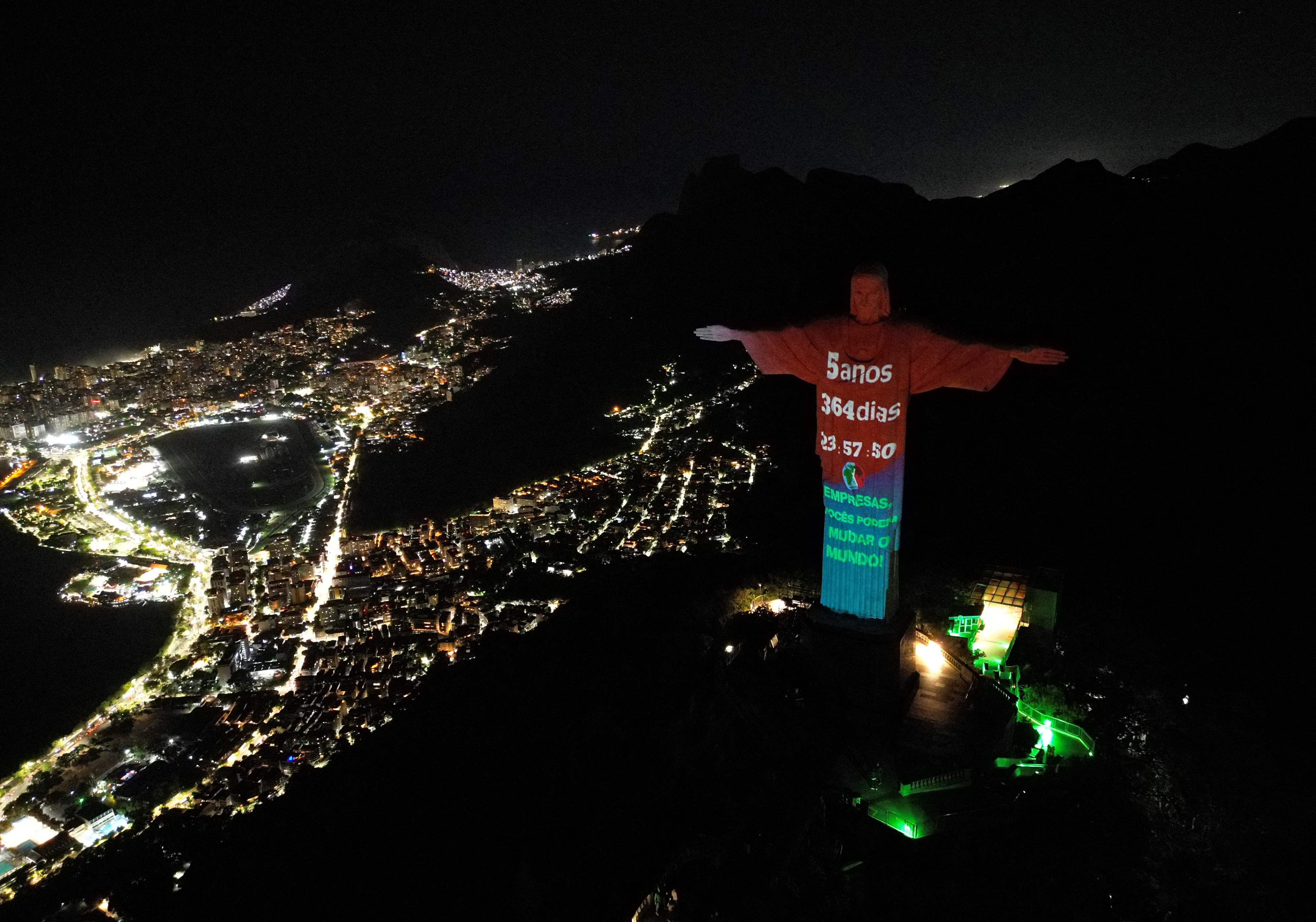 The Climate Clock – which indicates the alleged time left to act to limit global warming to 1.5 degrees Celsius – is projected onto the Christ the Redeemer statue, in Rio de Janeiro, Brazil, on July 22, 2023. (Photo by Carlos Fabal/AFP Photo)
