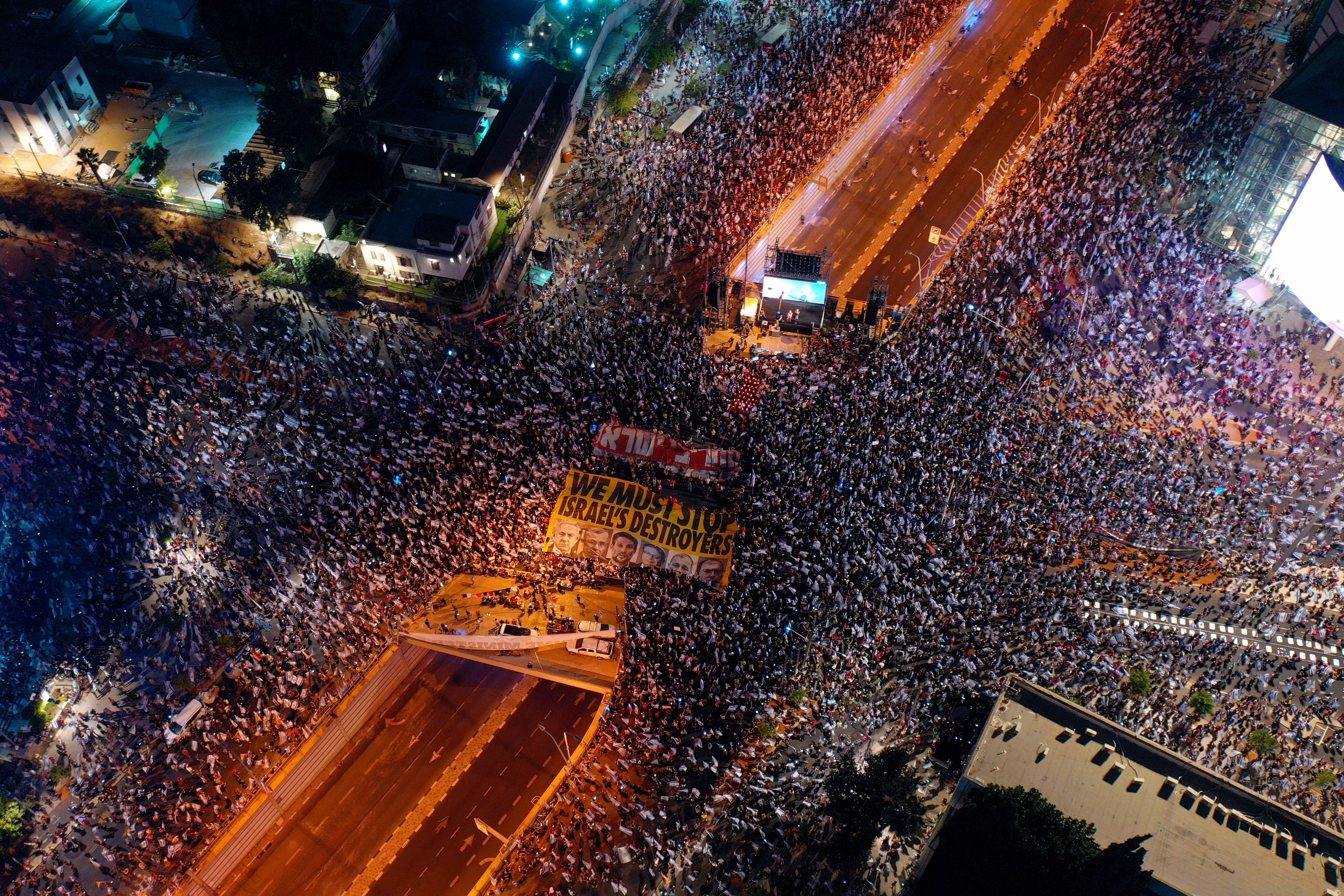 An aerial picture shows Israeli demonstrators raising banners and waving flags during a rally in Tel Aviv to protest the Israeli government's judicial overhaul plan, on July 1, 2023. (Photo by Gil Cohen-Magen/AFP Photo)