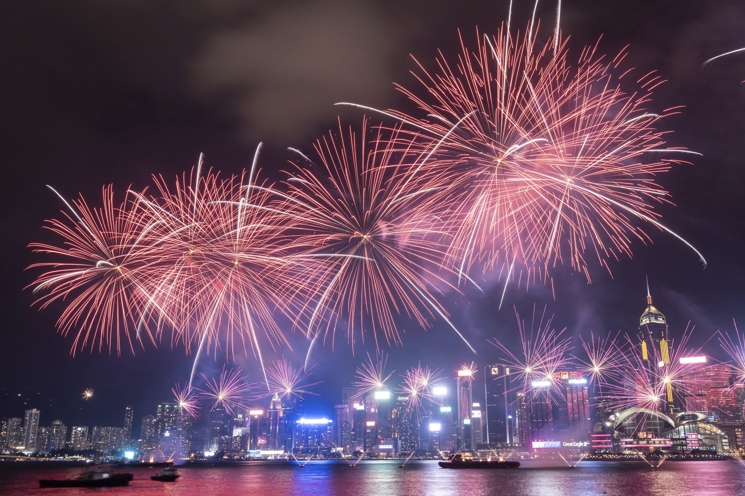 Fireworks explode over Victoria Harbour to mark the 75th National Day of the People's Republic of China, at Tsim Sha Tsui in Hong Kong, Tuesday, October 1, 2024. (Phoot by Chan Long Hei/AP Photo)