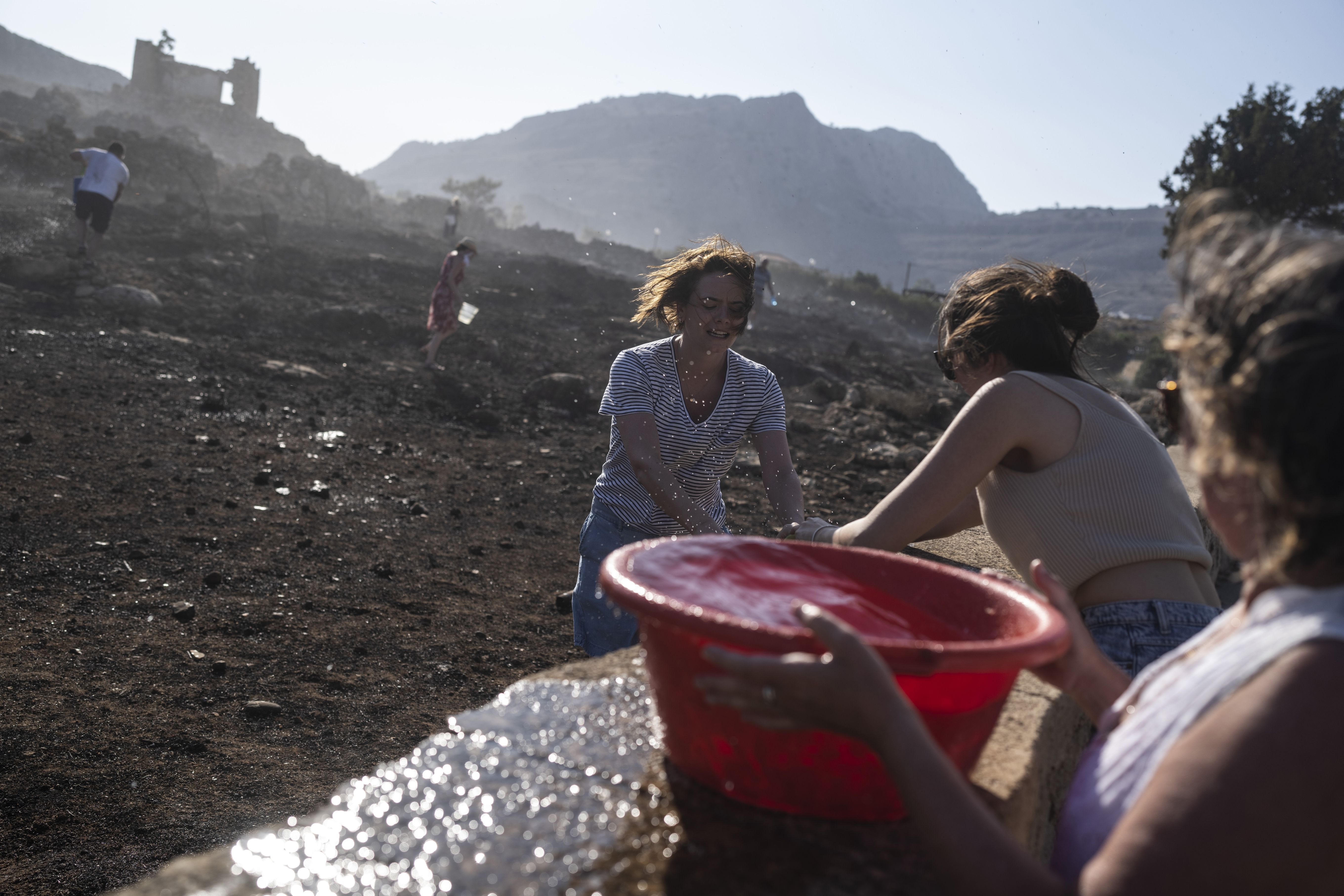 German tourists together with local residents try to extinguish a fire, near the seaside resort of Lindos, on the Aegean Sea island of Rhodes, southeastern Greece, on Monday, July 24, 2023. A weeklong wildfire on the Greek resort island of Rhodes tore past defenses Monday, forcing more evacuations, as three major fires raged elsewhere in the country fueled by strong winds and successive heat waves that left scrubland and forests tinder-dry. (Photo by Petros Giannakouris/AP Photo)