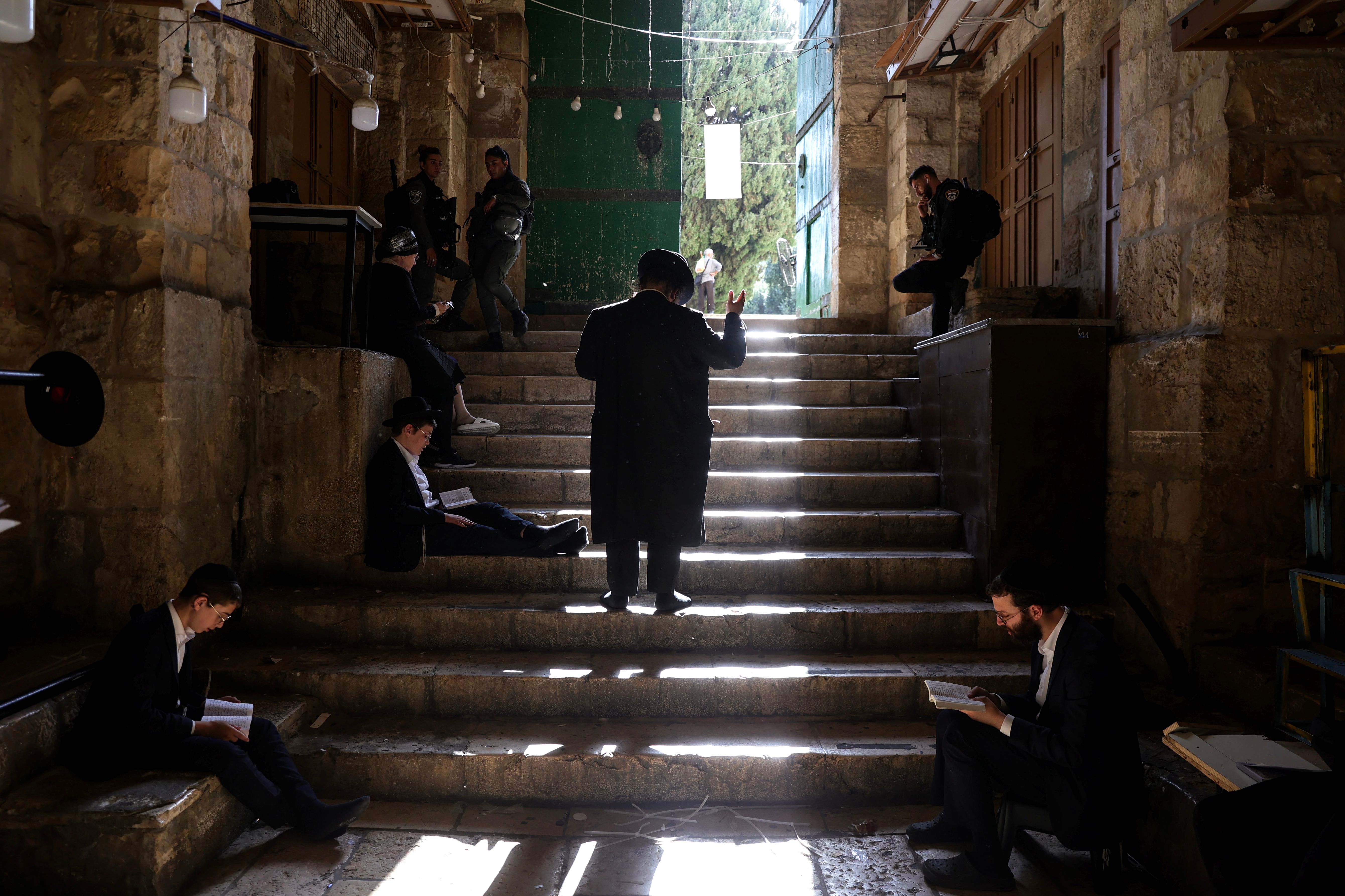 Israeli police officers guard the door leading to Al-Aqsa Mosque compound as Orthodox Jews pray and read from the book of Eicha (Book of Lamentations) to mark Tisha B'av, near The Western Wall, in the Old City of Jerusalem, 27 July 2023. In Judaism, the Tisha B'Av is an annual fast day to mark the destruction of the first and the second temple by the Babylonian and the Roman Empires in Jerusalem. During Tisha B'av, Ultra-Orthodox Jews stay up all night and sleep at the Western Wall as they recite lamentations focusing on the destruction of the ancient temple, that was located on the other side of the ancient wall, on the Temple Mount. (Photo by Abir Sultan/EPA/EFE/Rex Features/Shutterstock)