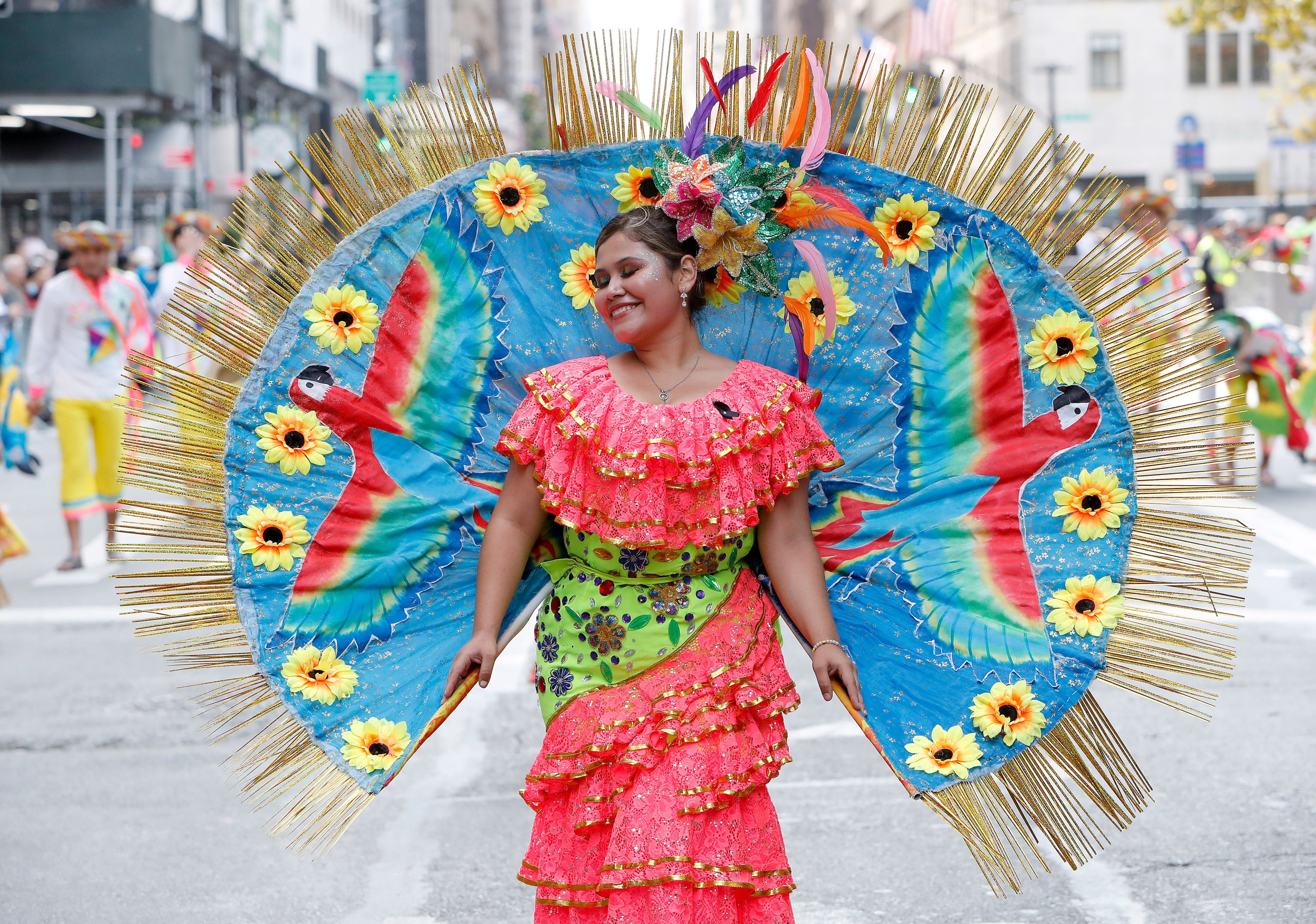 Marchers wear traditional costumes in the annual Hispanic Day Parade in New York on October 12, 2024, celebrating the heritage of 20 Spanish-speaking countries. (Photo by Andrew Schwartz/Splash News and Pictures)