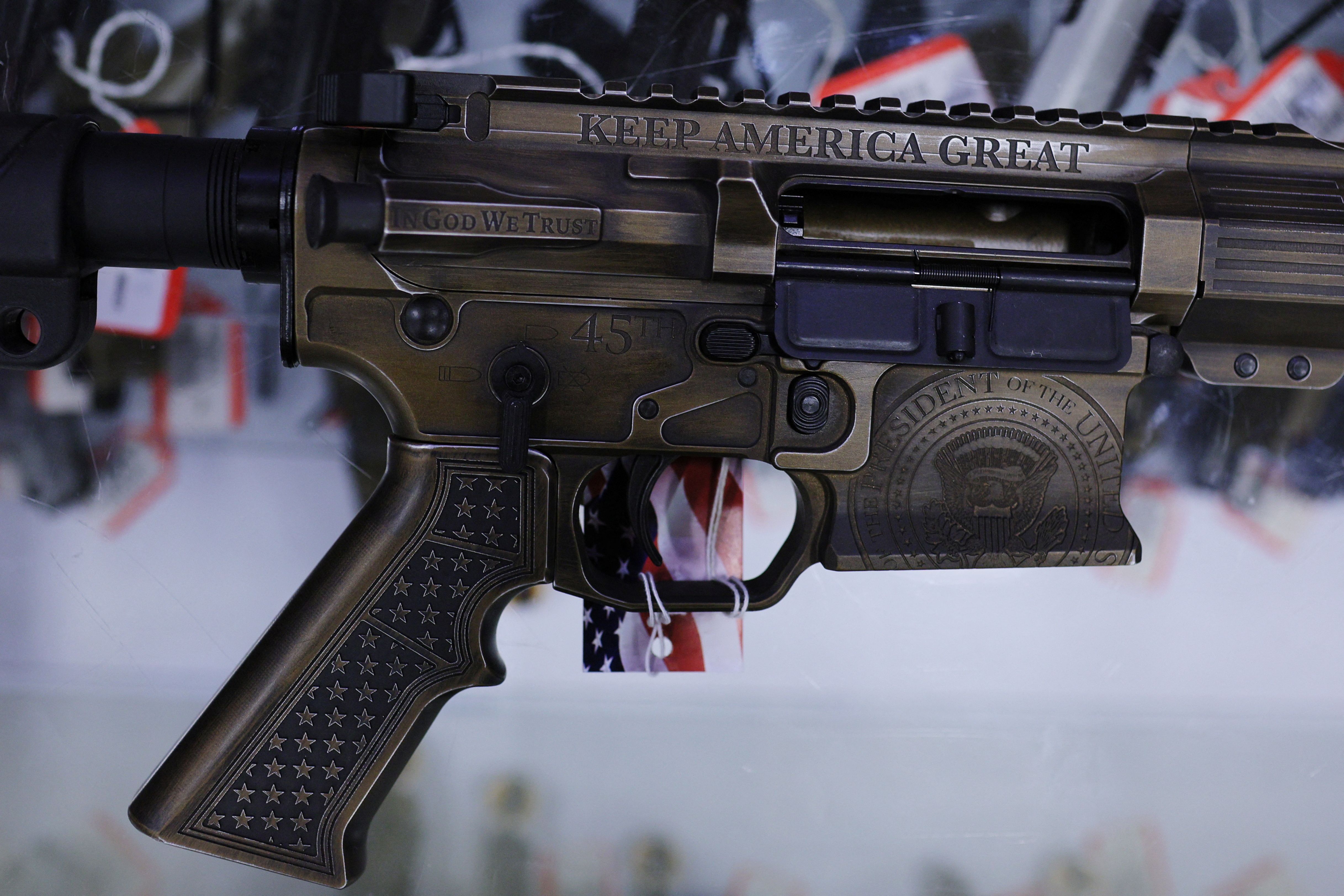 An Auto Ordnance AR-15 rifle commemorating Donald Trump is displayed at Kahr Arms/Tommy Gun Warehouse, which is hosting the Rod of Iron Freedom Festival, in Greeley, Pennsylvania, on October 12, 2024. (Photo by Brian Snyder/Reuters)