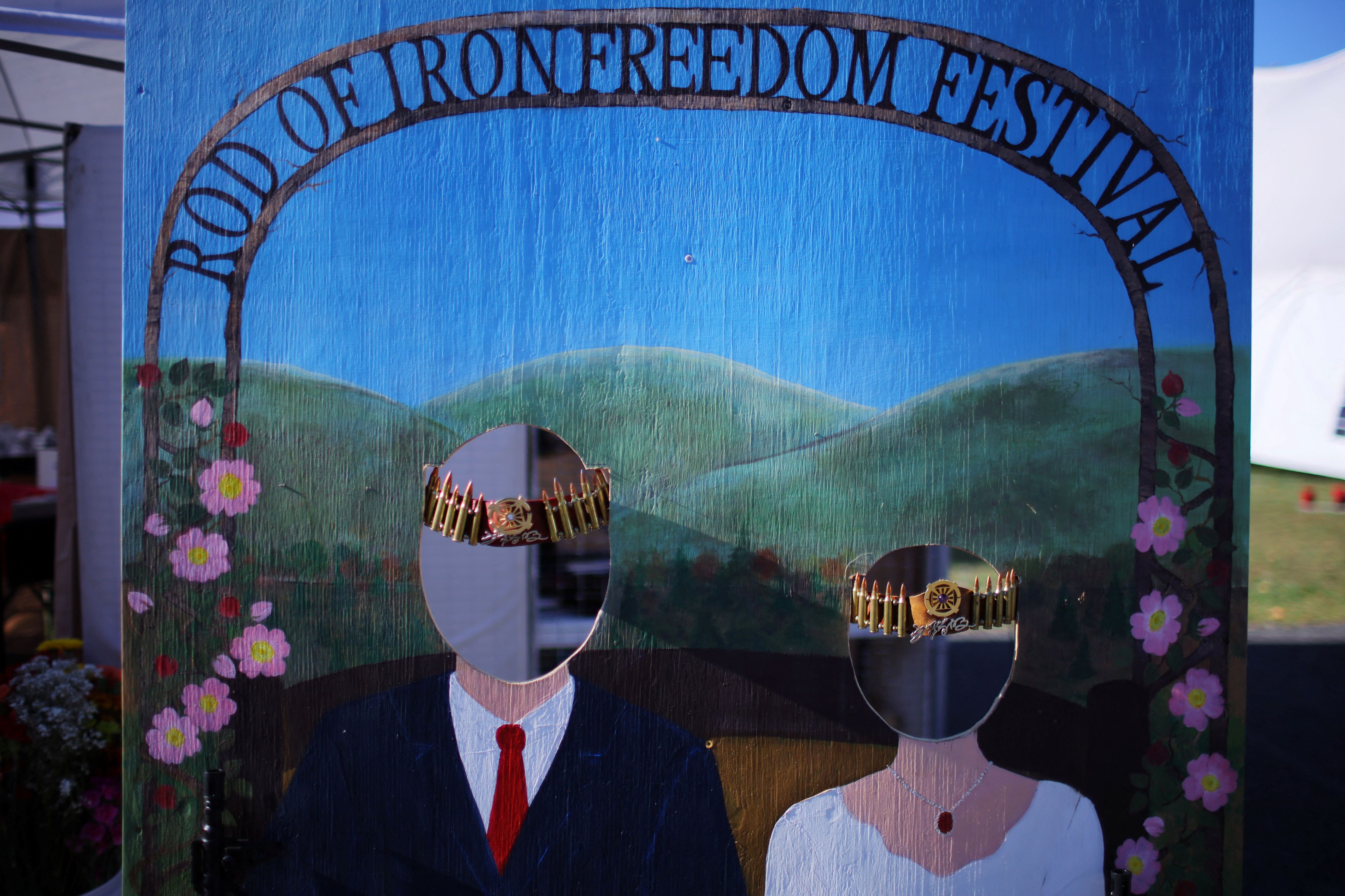 A board with cut-outs for faces is displayed for attendees to pose for photographs with a crown of bullets at the Rod of Iron Freedom Festival, in Greeley, Pennsylvania, on October 12, 2024. (Photo by Brian Snyder/Reuters)