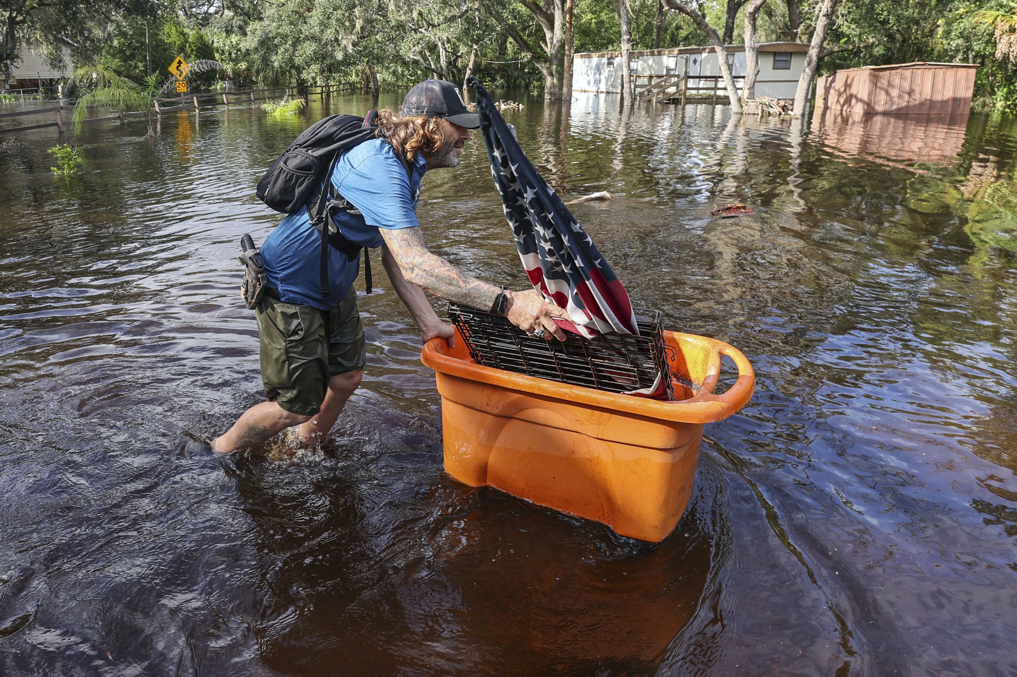 A man who identified himself as Jesse walks out through floodwaters of the Anclote River after Hurricane Milton hit the region, Thursday, October 10, 2024, in New Port Richey, Fla. (Photo by Mike Carlson/AP Photo)