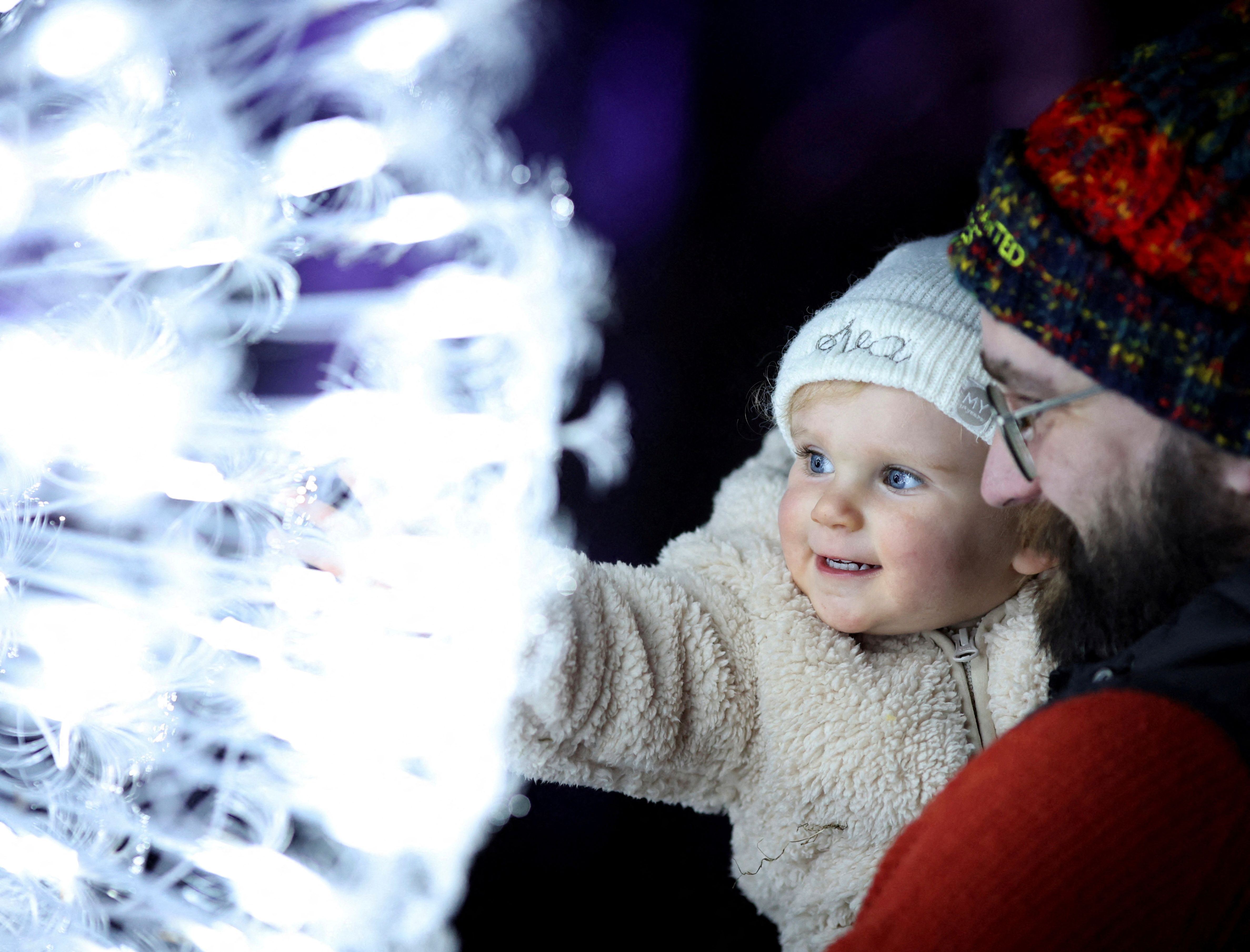A baby views an installation at the preview ahead of the Enchanted Forest 2024 event, an annual sound and light show, at Faskally Wood Pitlochry, Scotland, Britain on October 2, 2024. (Photo by Russell Cheyne/Reuters)