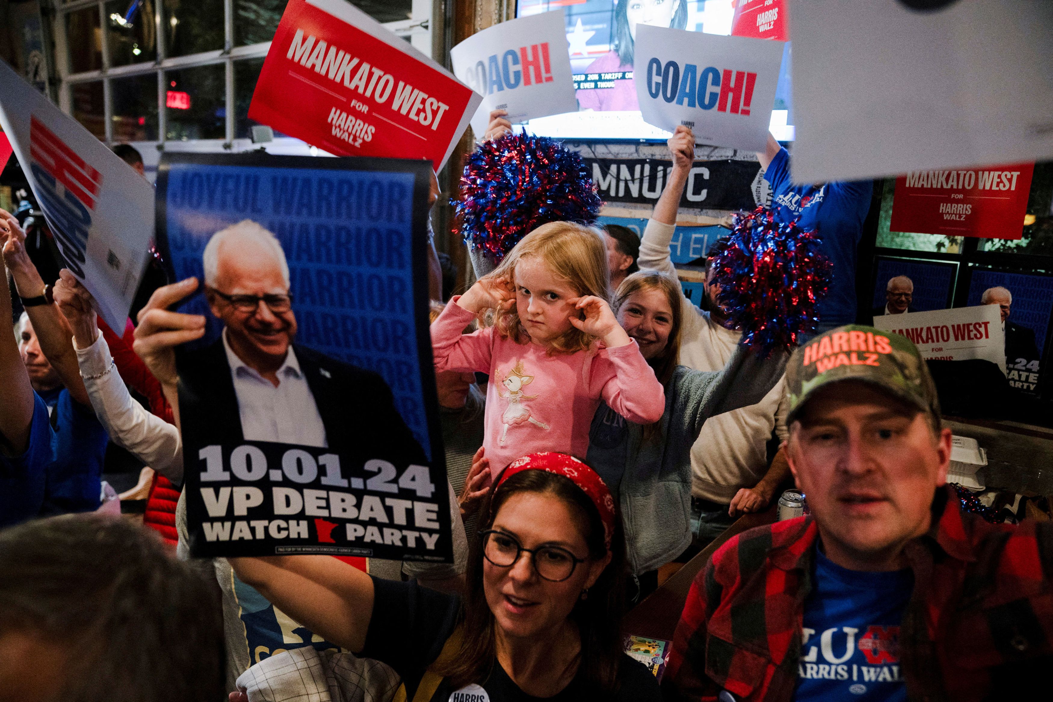 Margaret Jagdfeld, 4, covers her ears as alumni of Mankato West High School, where vice presidential candidate Tim Walz formerly taught, cheer for Walz at a debate watch party in St. Paul, Minnesota, on Tuesday, October 1, 2024. (Photo by Erica Dischino/Reuters)
