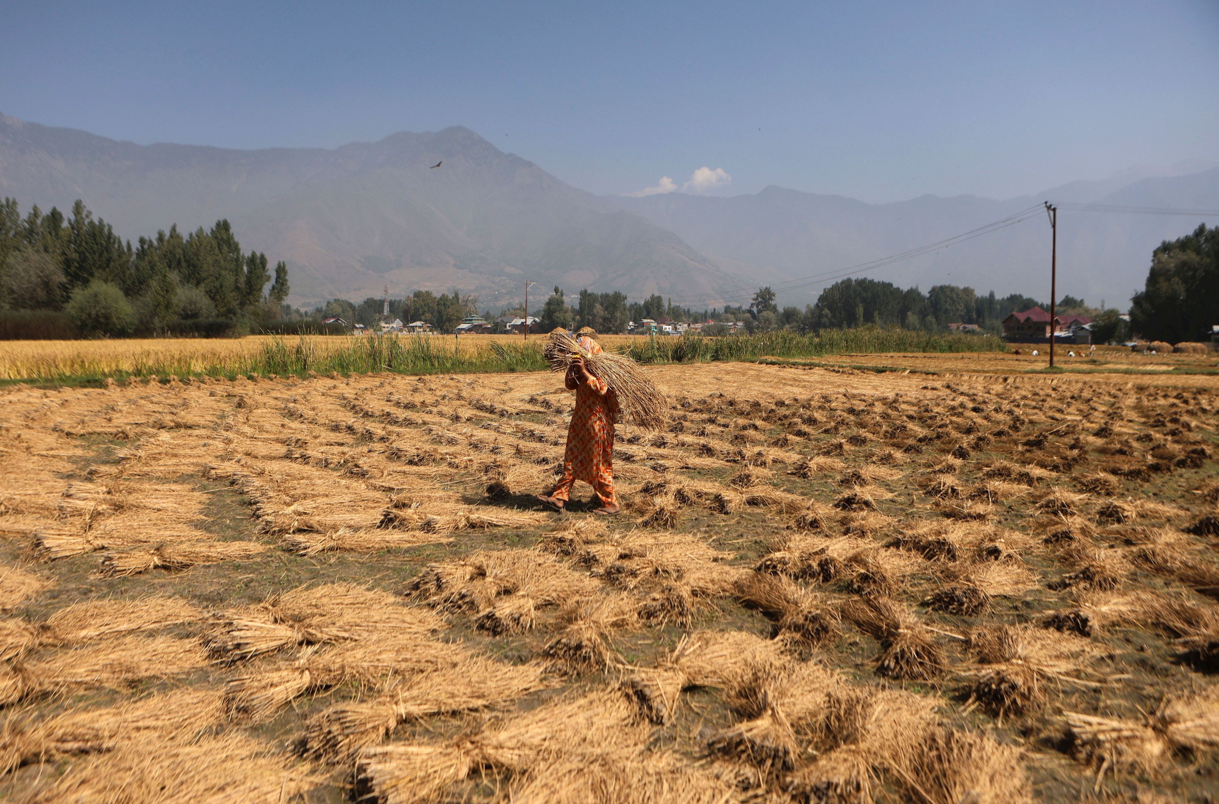 A Kashmiri female farmer works in a paddy during rice harvest on the outskirts of Srinagar, the summer capital of Indian Kashmir, 03 October 2024. The autumn season marks the paddy harvesting period in Indian Kashmir. (Photo by Farooq Khan/EPA)