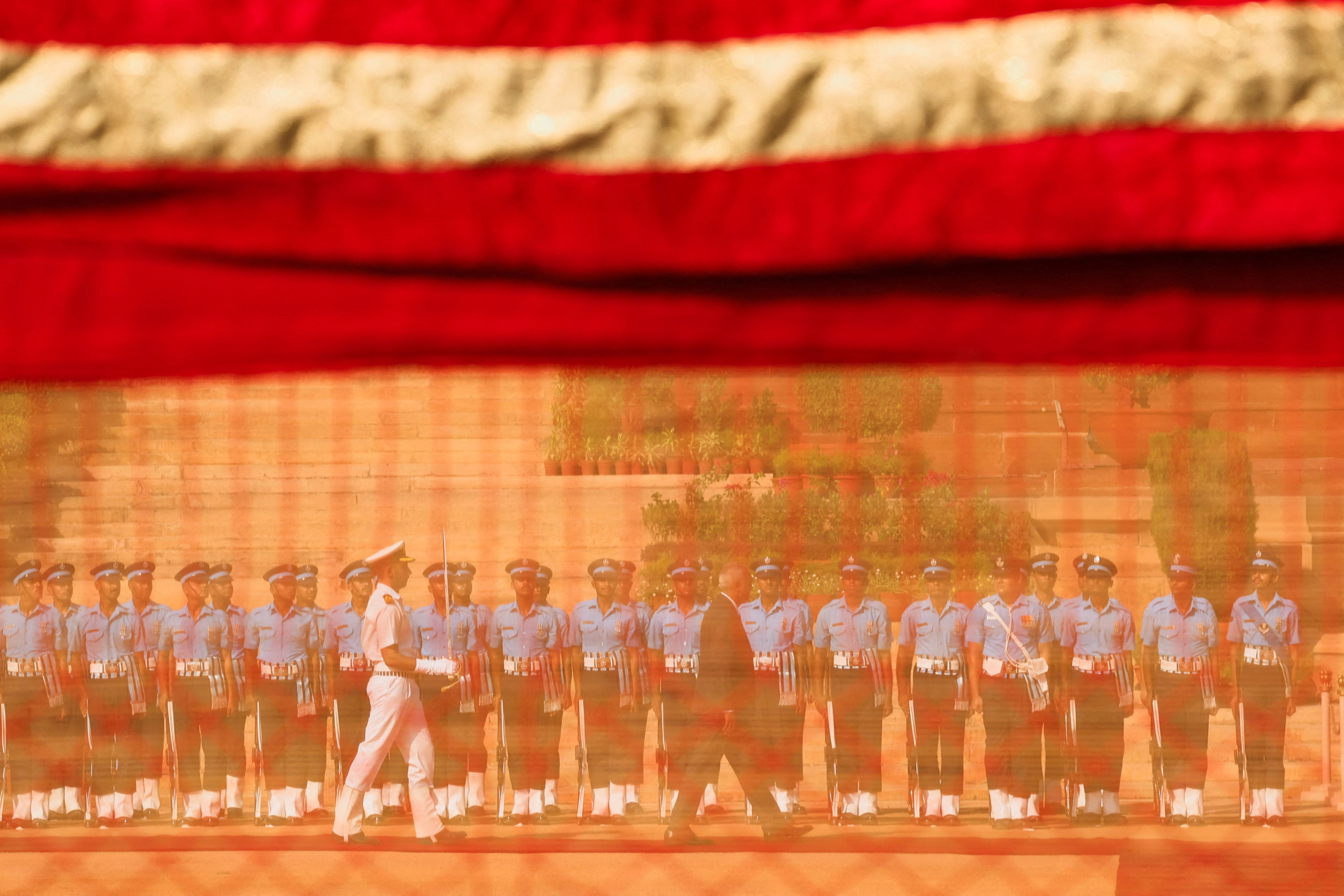 Maldives' President Mohamed Muizzu inspects an honour guard during his ceremonial reception at the forecourt of India's Presidential Palace Rashtrapati Bhavan in New Delhi, India, on October 7, 2024. (Photo by Adnan Abidi/Reuters)