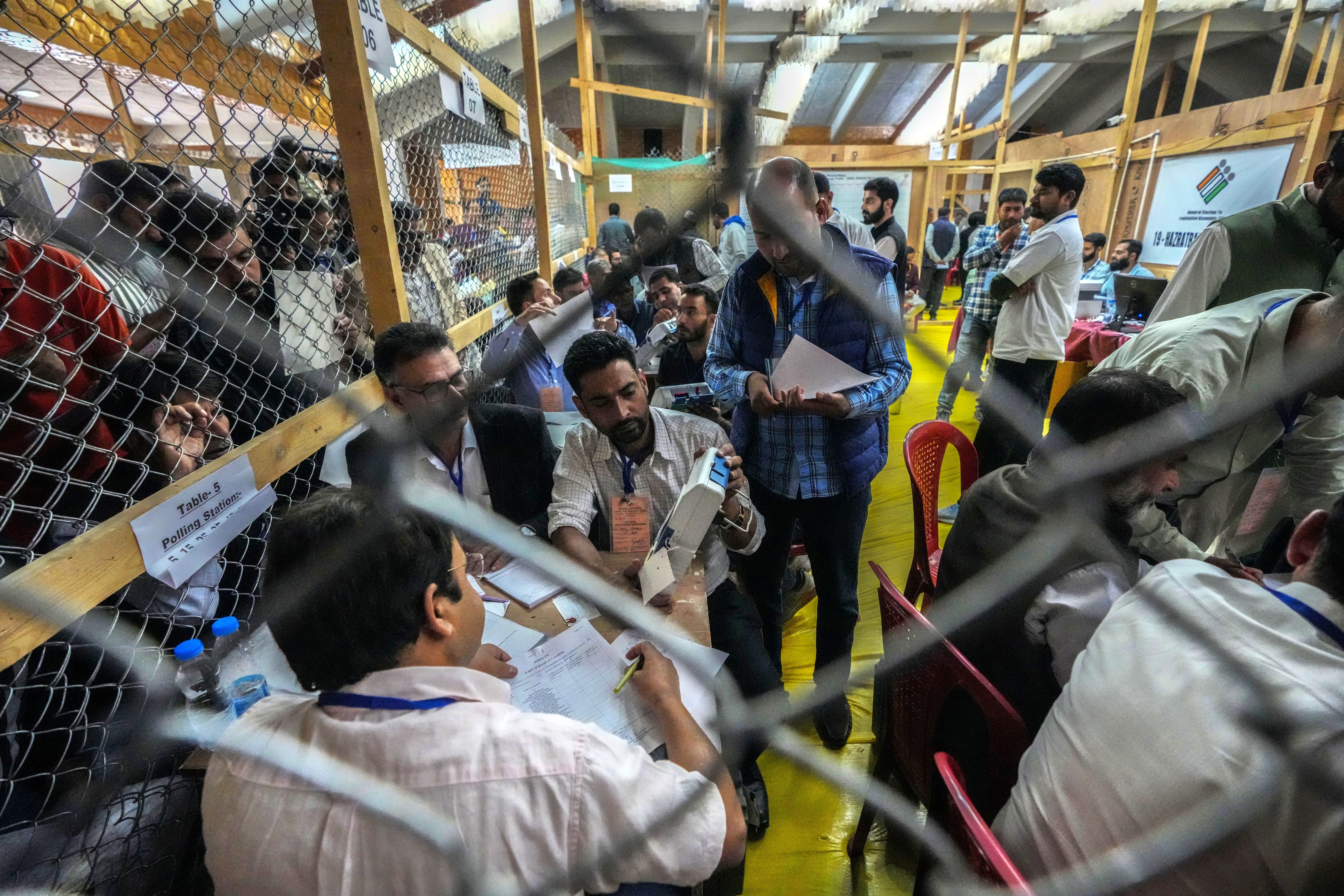 A polling official displays a sealed electronic voting machine to polling agents as they count the votes in the recent election for a local government in Indian-controlled Kashmir on the outskirts of Srinagar, Tuesday, October 8, 2024. (Photo by Mukhtar Khan/AP Photo)