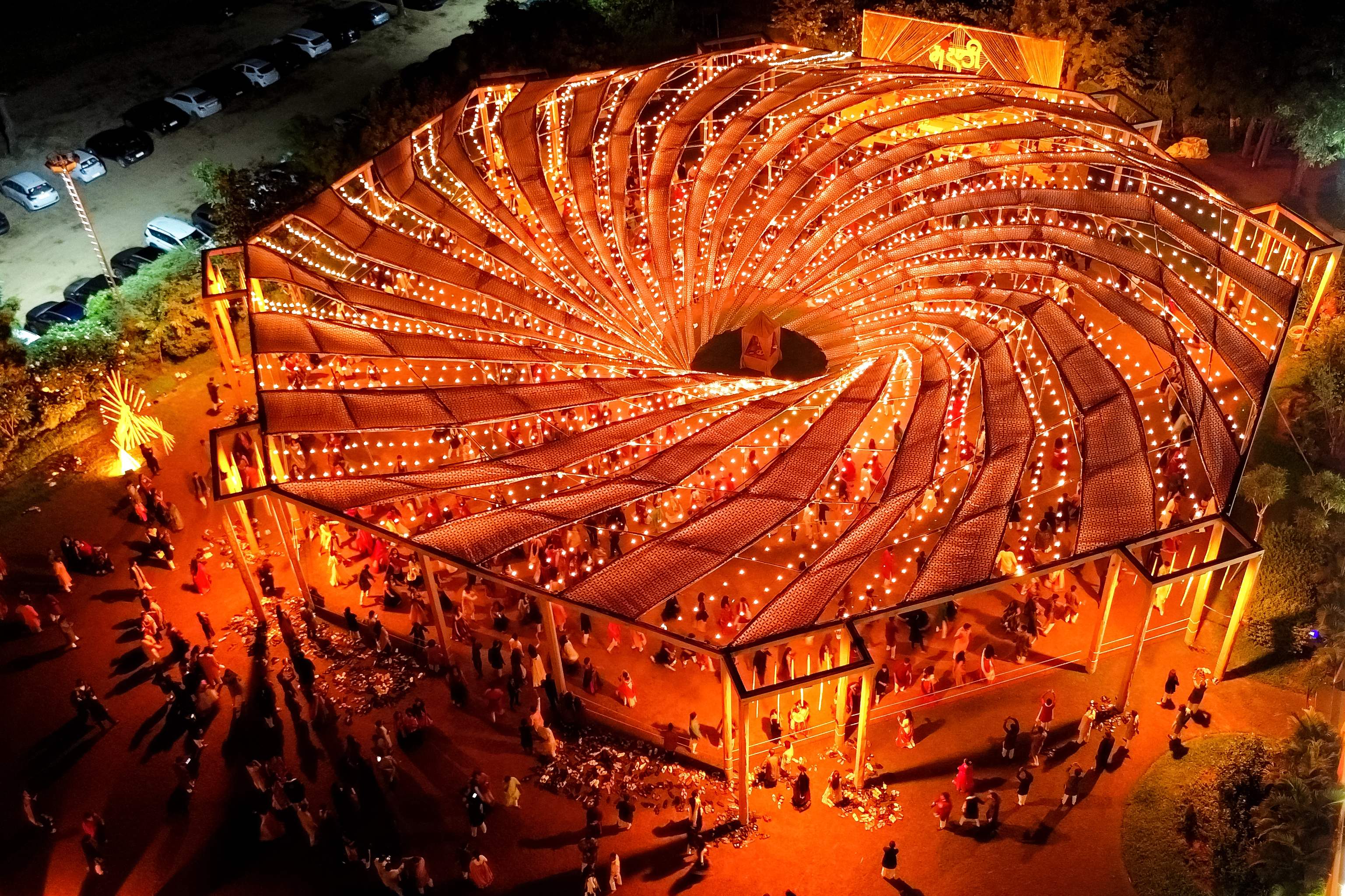 An aerial view shows revellers wearing traditional clothes as they dance at a “Garba” during the Hindu festival of Navratri, in the outskirts of Ahmedabad on October 9, 2024. (Photo by Sam Panthaky/AFP Photo)