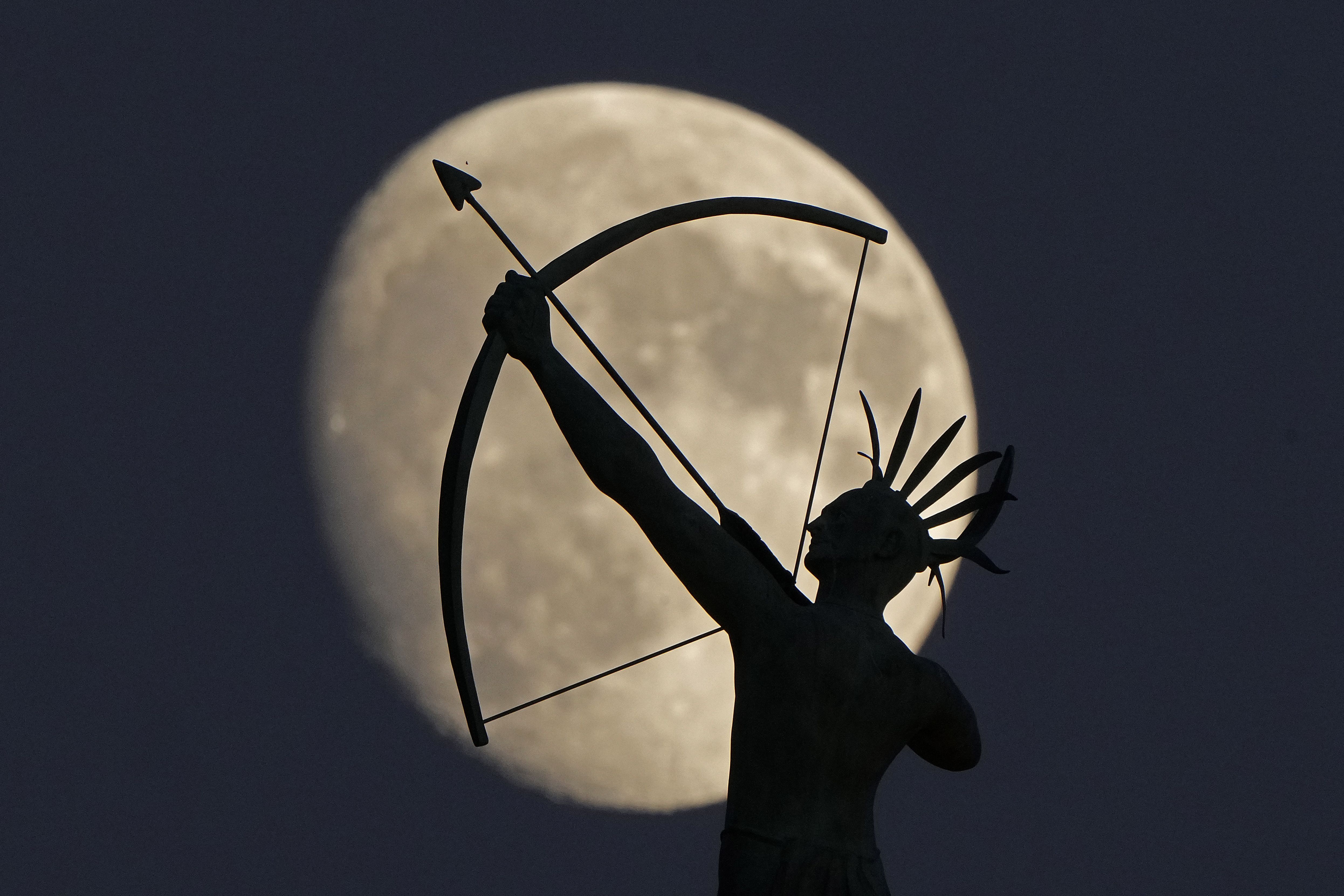 The bronze sculpture of “Ad Astra” a Kansa Indian, perched atop the Kansas State Capitol dome is silhouetted against the waxing moon, Monday, October 14, 2024, in Topeka, Kan. (Photo by Charlie Riedel/AP Photo)