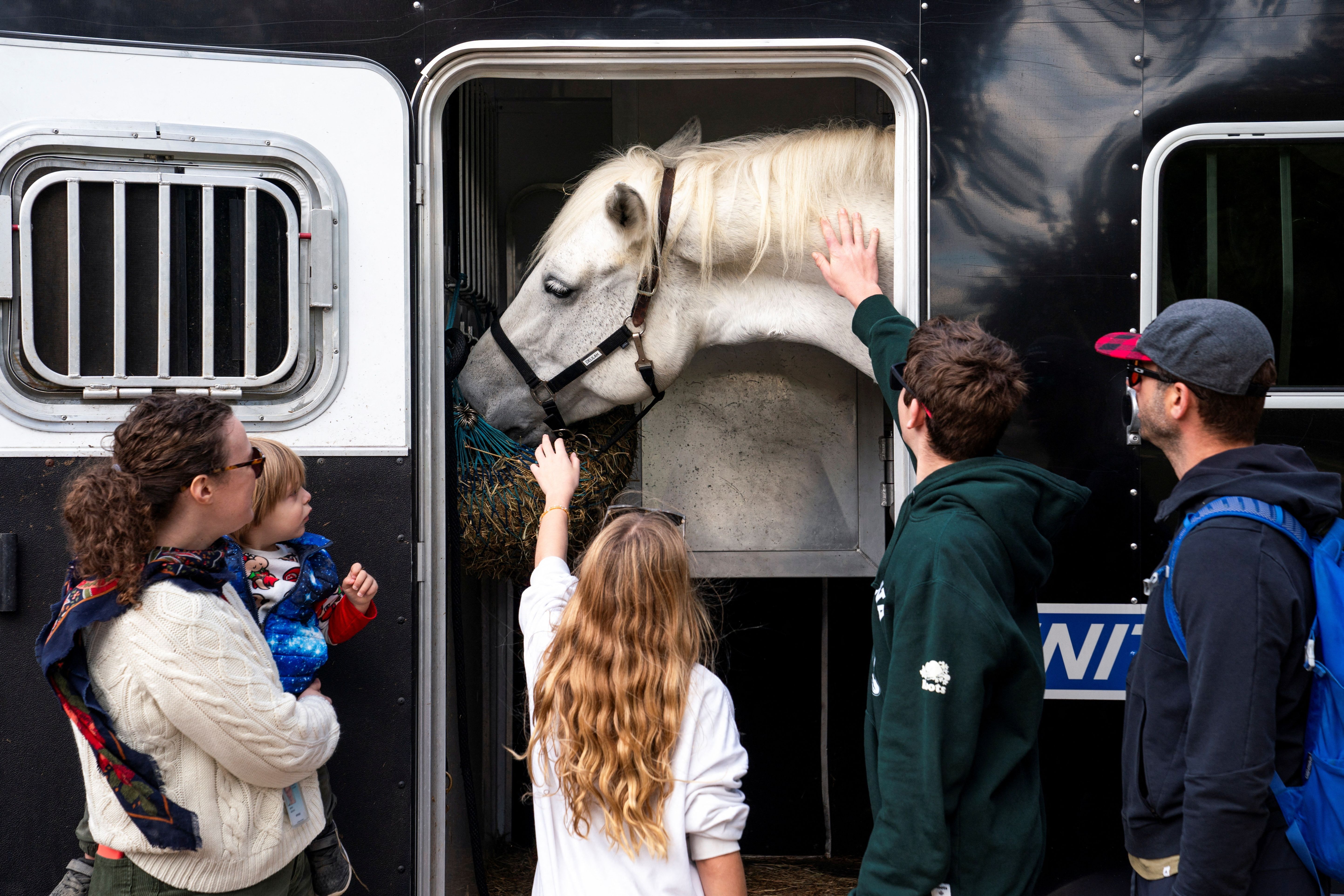 Pedestrians react to a U.S. Park Police horse on the National Mall in Washington, U.S., October 16, 2024. (Photo by Nathan Howard/Reuters)