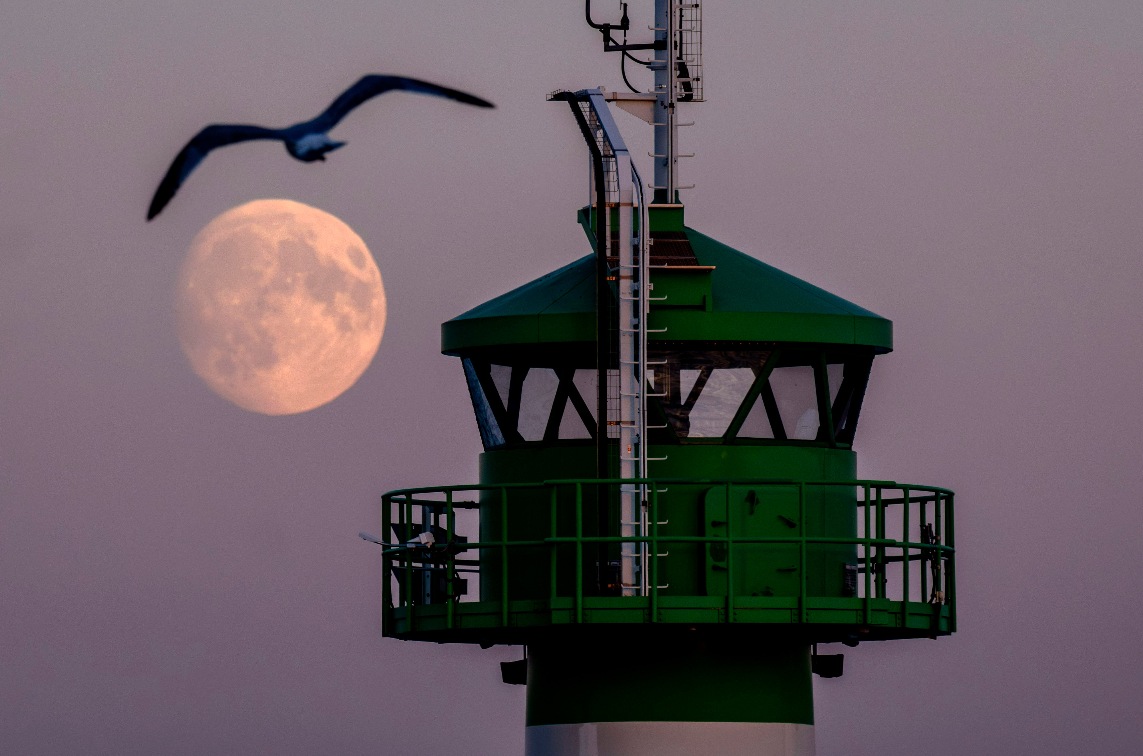The moon rises behind the lighthouse at the harbor of Travemuende, northern Germany, Tuesday, October 15, 2024. (Photo by Michael Probst/AP Photo)