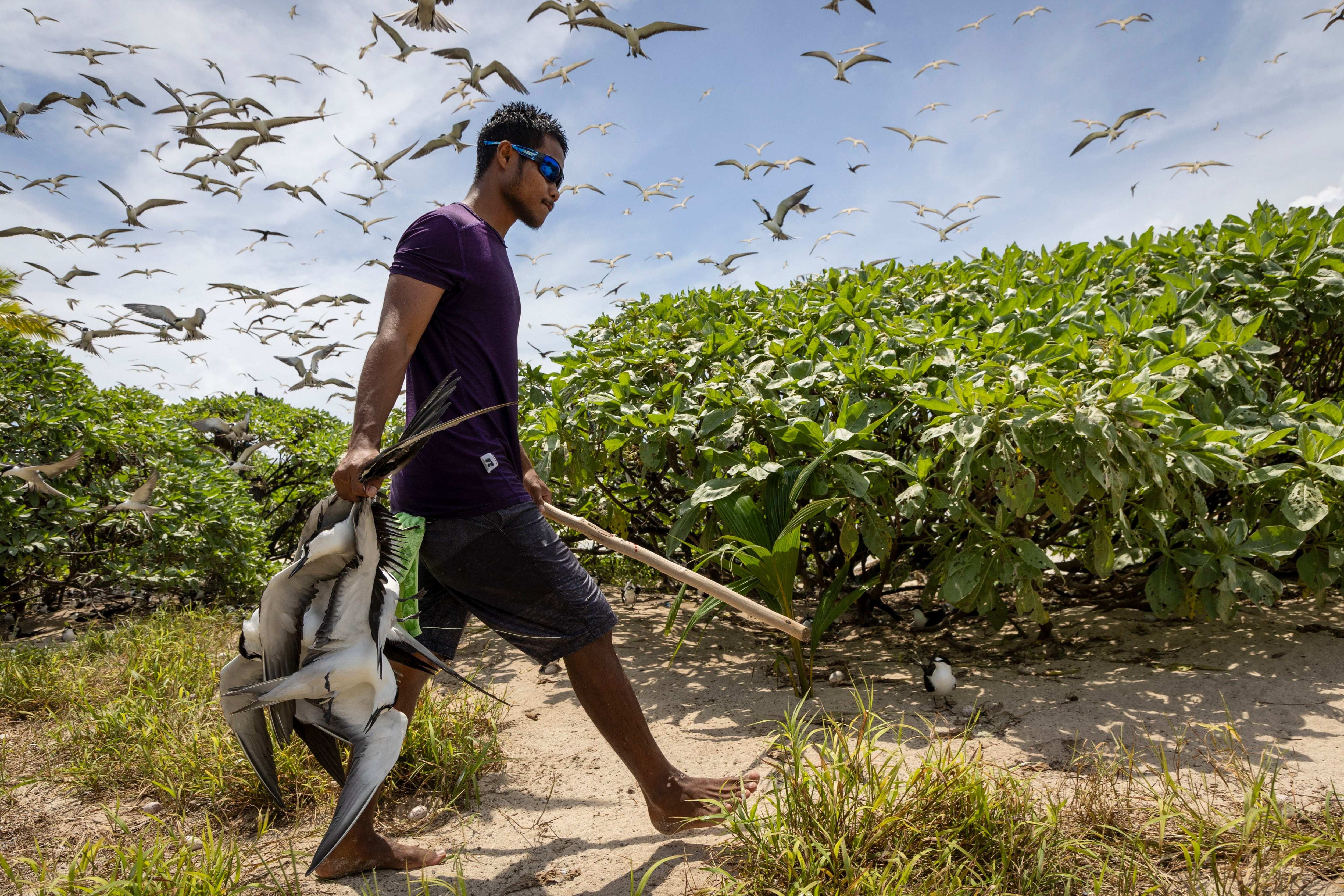 Carson Ngiralbong, a ranger with the Hatohobei State Rangers, collects bridled tern for dinner on July 17, 2024, on Helen Island, Palau. (Photo by Yannick Peterhans/AP Photo)