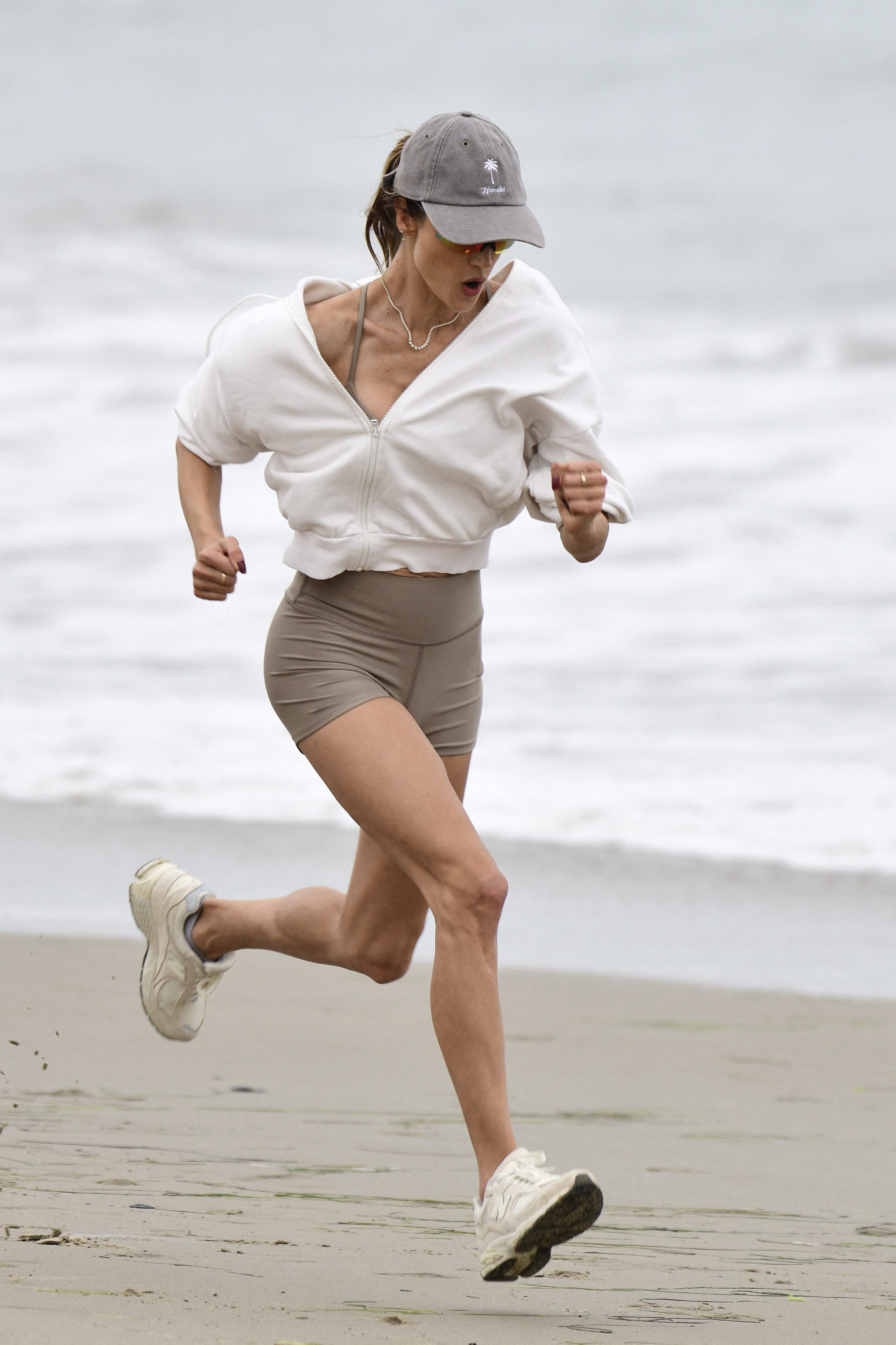 Brazilian model Alessandra Ambrosio is seen working out on the beach with a friend on October 10, 2024. (Photo by The Mega Agency)