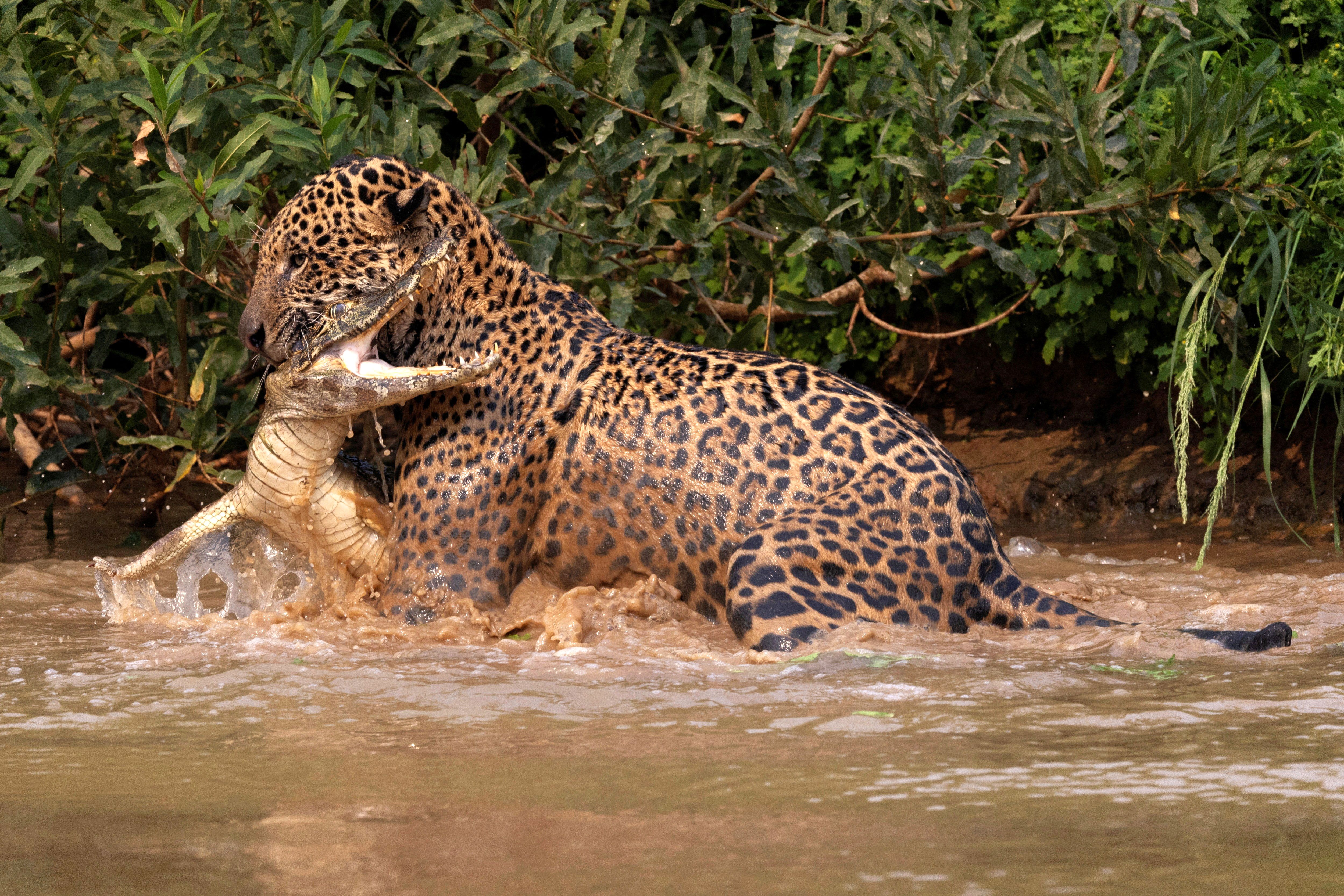 A male jaguar named Ipepo, by NGO Jaguar ID, bites an alligator at Encontro das Aguas State Park, in the Pantanal, the largest wetland in the world, in Pocone, Mato Grosso, Brazil, on October 6, 2024. (Photo by Sergio Moraes/Reuters)