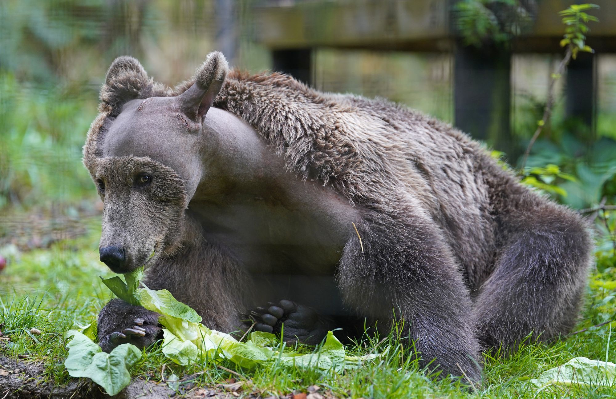 Boki, a two-year-old brown bear, in his enclosure at the Wildwood Trust in Canterbury, Kent, UK on Monday. October 14, 2024 as he recovers from surgery to drain fluid from his brain, the first time an operation of the kind had been carried out in the UK. (Photo by Gareth Fuller/PA Images via Getty Images)