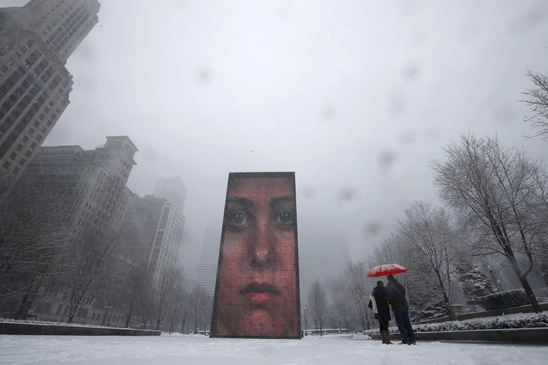 A couple takes pictures of an LED display on 50-ft tall glass towers, projecting images of faces in Crown Plaza during snow in Chicago March 5, 2013. A deadly late winter storm dumped heavy snow on the Midwestern United States on Tuesday, contributing to numerous highway crashes and flight cancellations as it moved east toward the Ohio Valley and the mid-Atlantic states. (Photo by Jim Young/Reuters)