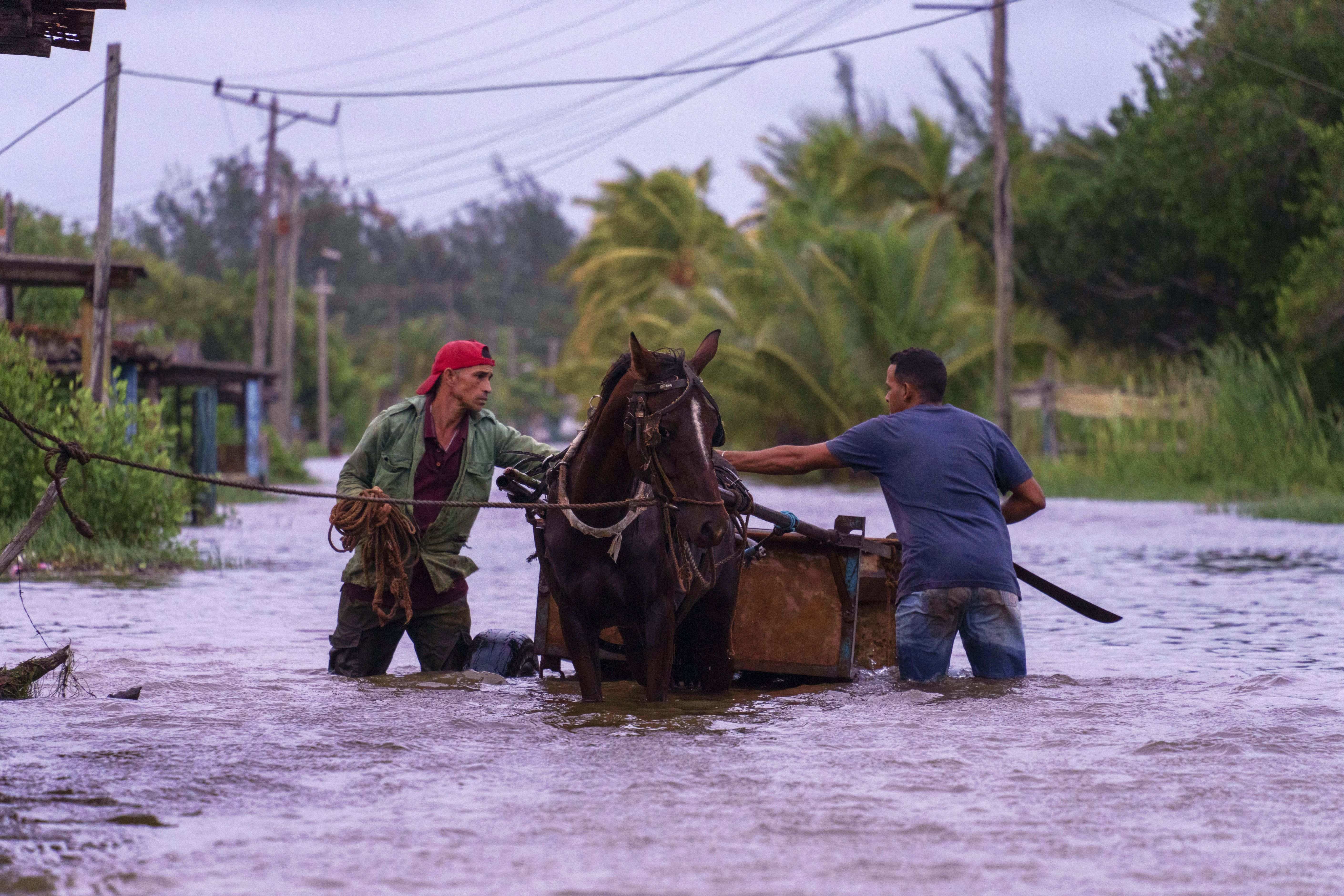 People traverse a flooded street with a horse-drawn carriage after the passage of Hurricane Helene in Guanimar, Artemisa province, Cuba, Wednesday, September 25, 2024. (Photo by Ramon Espinosa/AP Photo)