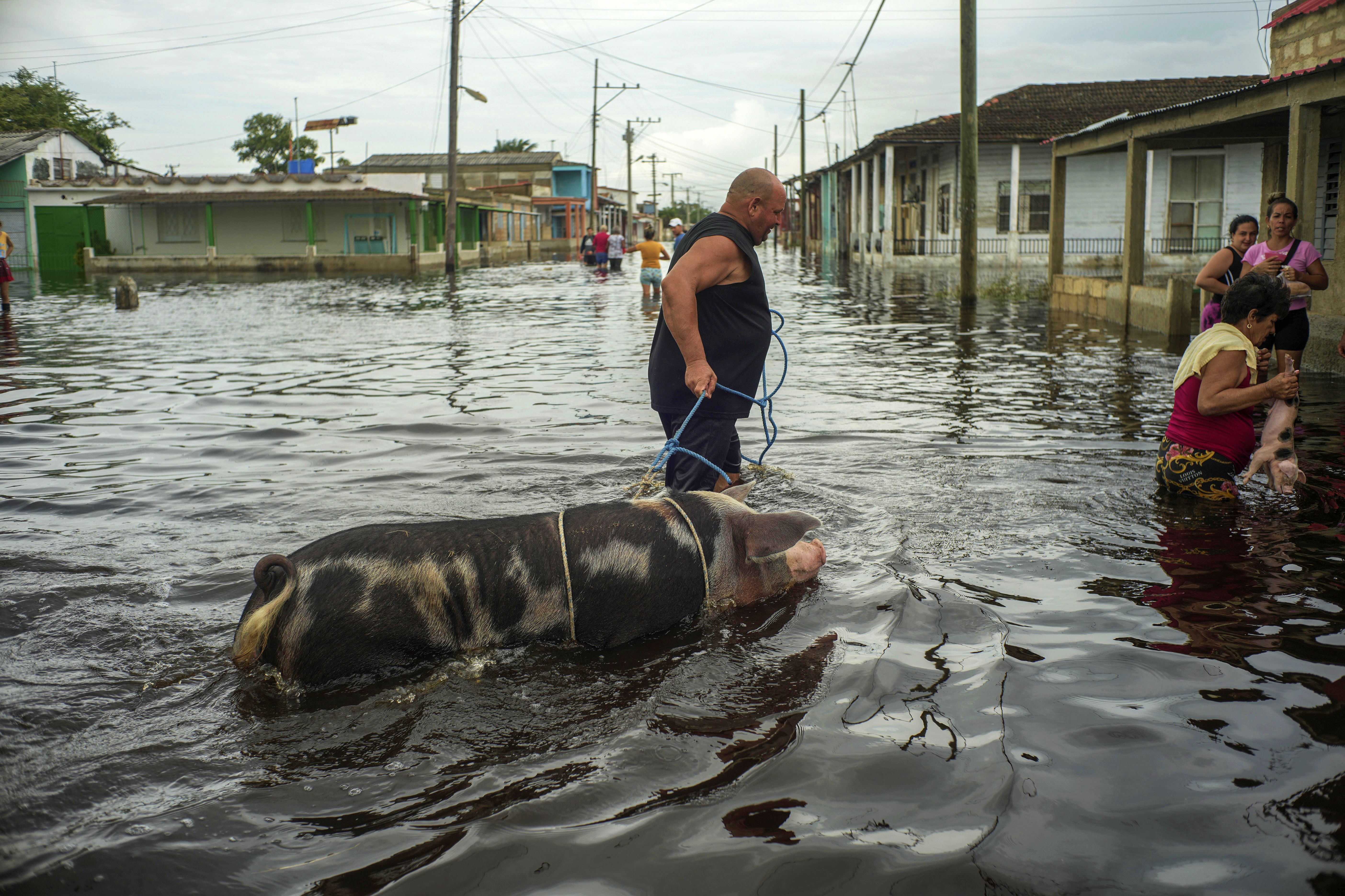 A resident leads his pig through a street flooded in the passing of Hurricane Helene, in Batabano, Mayabeque province, Cuba, Thursday, September 26, 2024. (Photo by Ramon Espinosa/AP Photo)