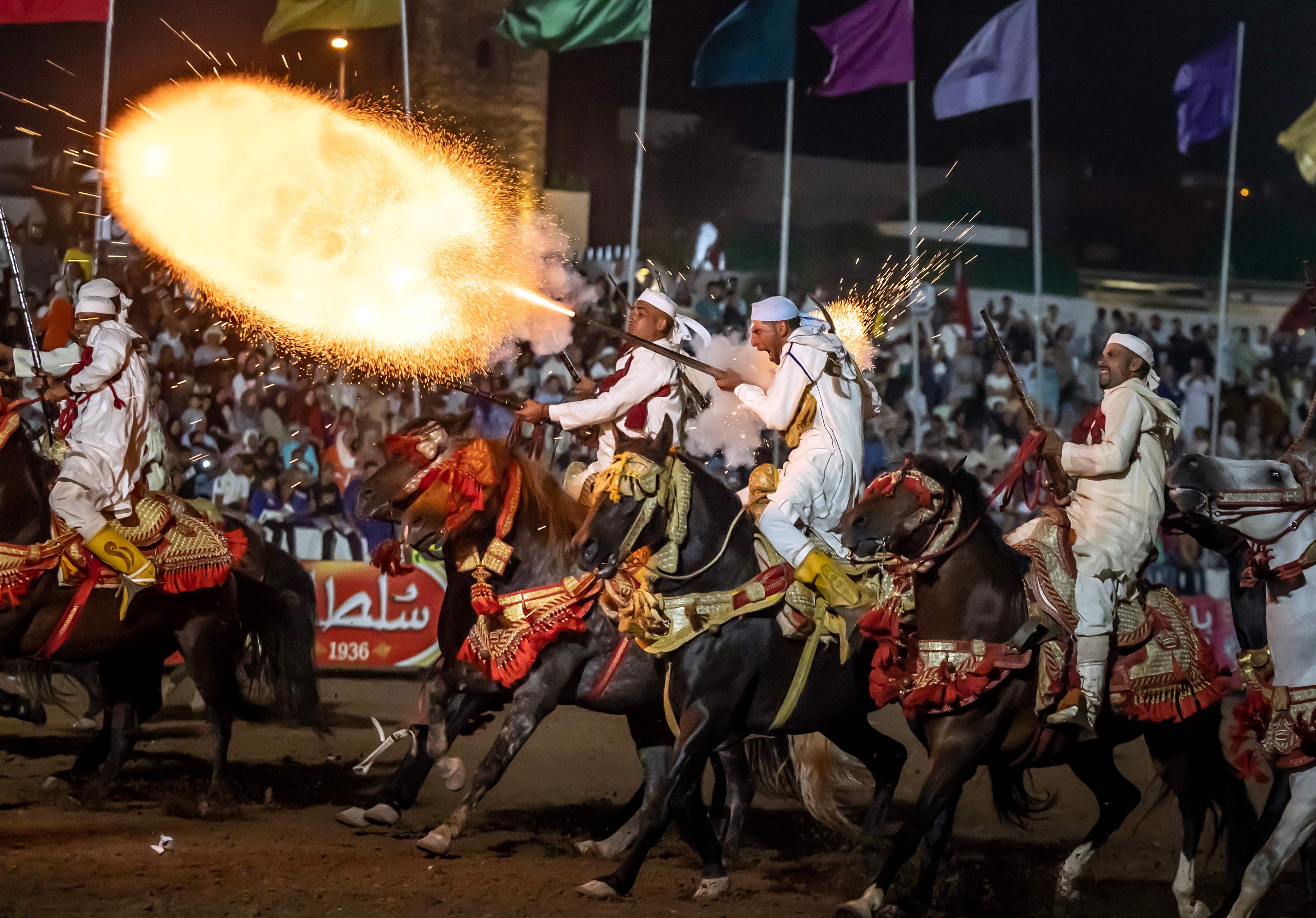 Moroccan horsemen fire their rifles during a performance to celebrate the annual Moussem festival in El Jadida on August 6, 2023. (Photo by Fadel Senna/AFP Photo)