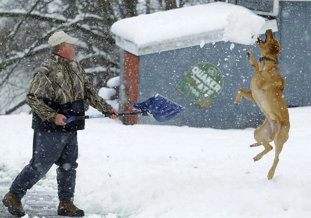 Bill Groves plays with his dog Red while shovelling snow during a massive blizzard near Mt. Jackson, Virginia March 6, 2013. Washington and its suburbs face what could be their heaviest snowfall in two years on Wednesday, as a fierce storm headed east after blanketing the Midwestern United States, snarling traffic and causing hundreds of flight cancellations. (Photo by Gary Cameron/Reuters)