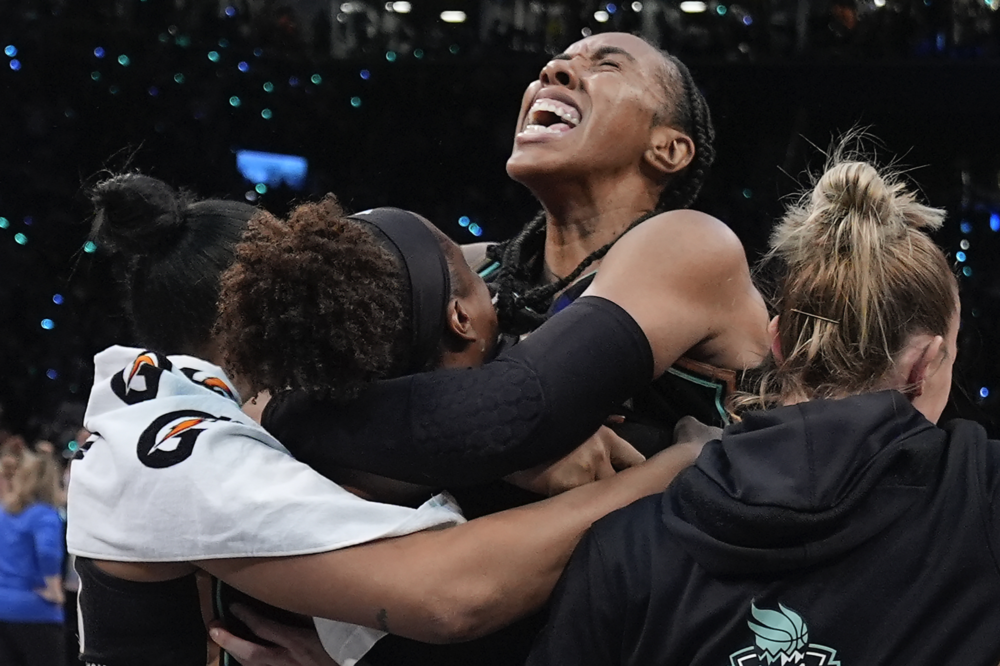 The New York Liberty celebrate after defeating the Minnesota Lynx in Game 5 of the WNBA basketball final series to win the WNBA championship, Sunday, October 20, 2024, in New York. (Photo by Pamela Smith/AP Phot)