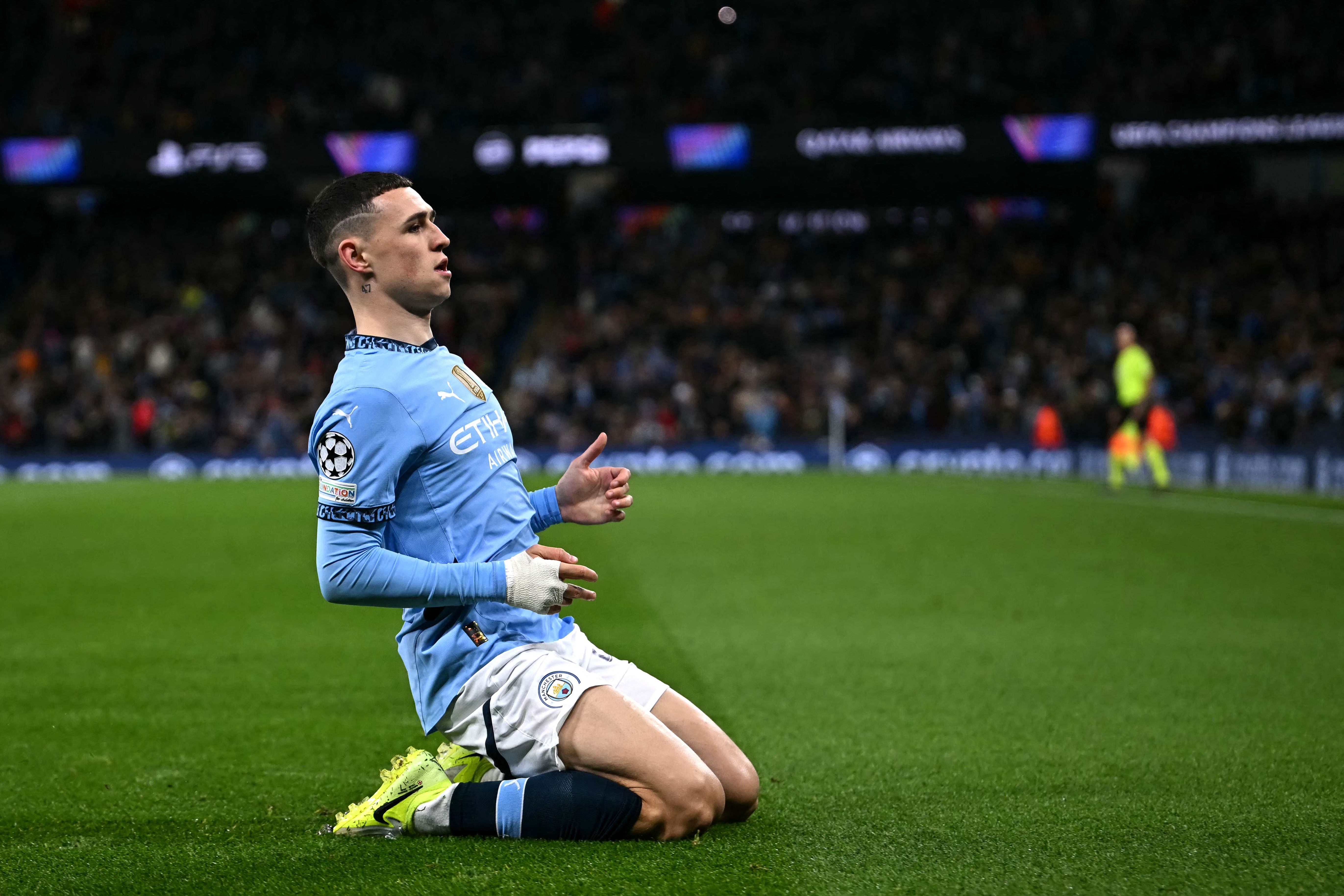 Manchester City's English midfielder #47 Phil Foden celebrates scoring the team's first goal during the UEFA Champions League football match between Manchester City and Sparta Prague at the Etihad Stadium in Manchester, north west England, on October 23, 2024. (Photo by Paul Ellis/AFP Photo)