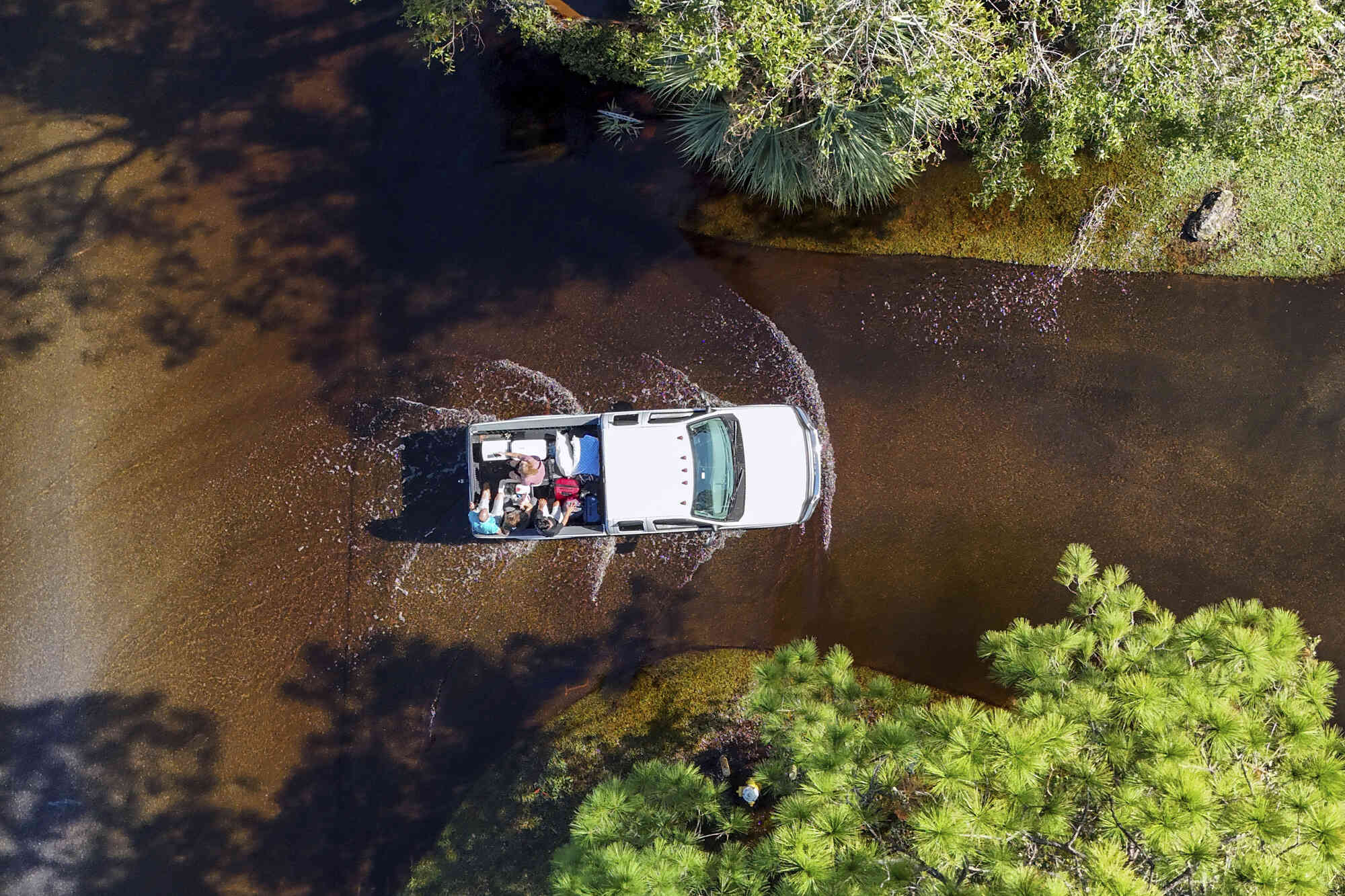 Two couples who evacuated get a ride back to their home through flooding after Hurricane Milton hit the region, Thursday, October 10, 2024, in Palm Harbor, Fla. (Photo by Mike Carlson/AP Photo)