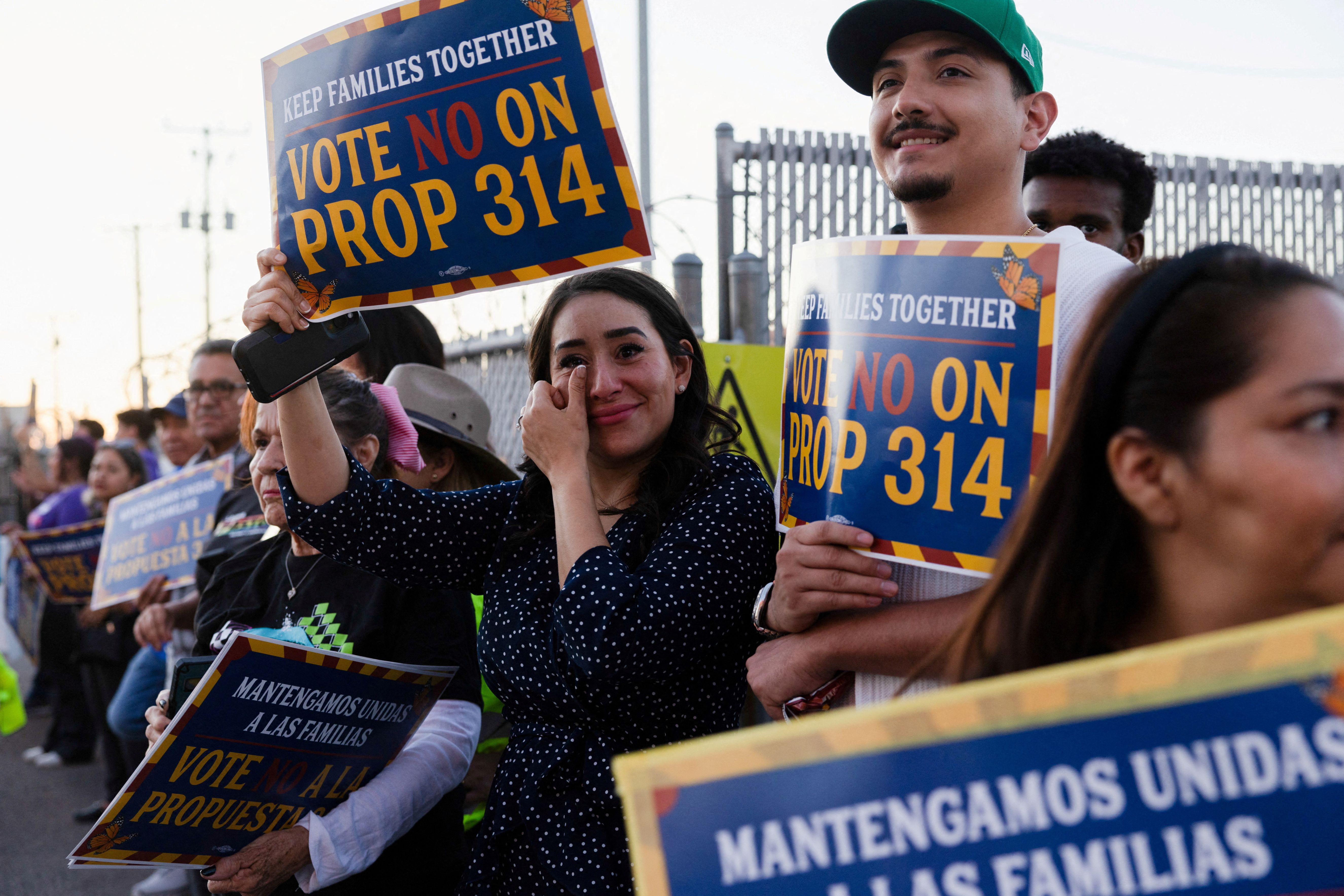People gather with posters outside a ballot drop-off location during a rally against Proposition 314 organised by immigrant rights activists, in Phoenix, Arizona on October 21, 2024. (Photo by Zoe Meyers/Reuters)