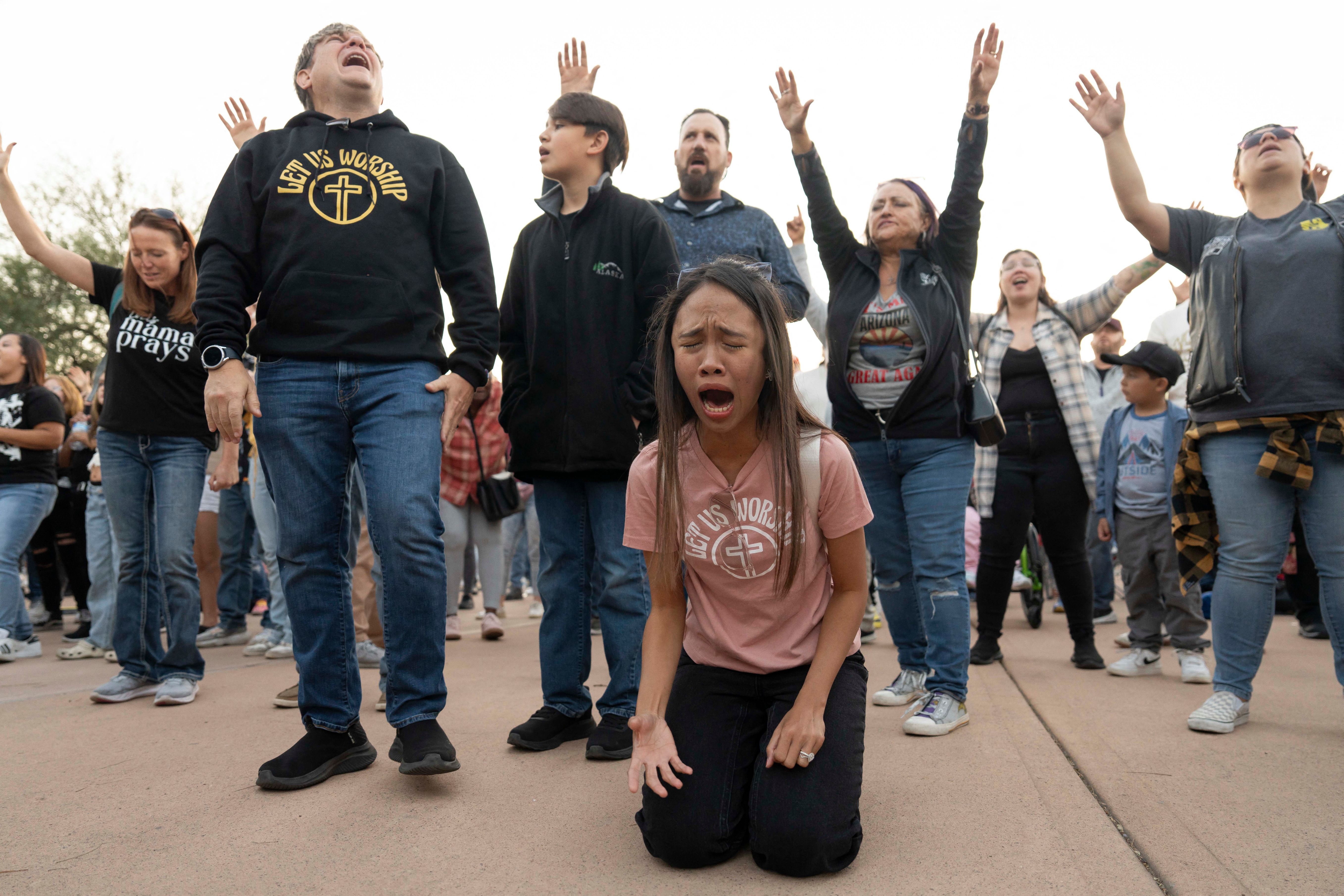 Congregants worship during the final stop of Sean Feucht’s Kingdom to the Capitol Tour at Wesley Bolin Memorial Plaza outside the Arizona State Capitol in Phoenix, Arizona, October 19, 2024. Traveling evangelical musician Sean Feucht, a Republican, has led a worship service at all 50 US state capitols and will perform in Washington, DC, next week. (Photo by Rebecca Noble/AFP Photo)