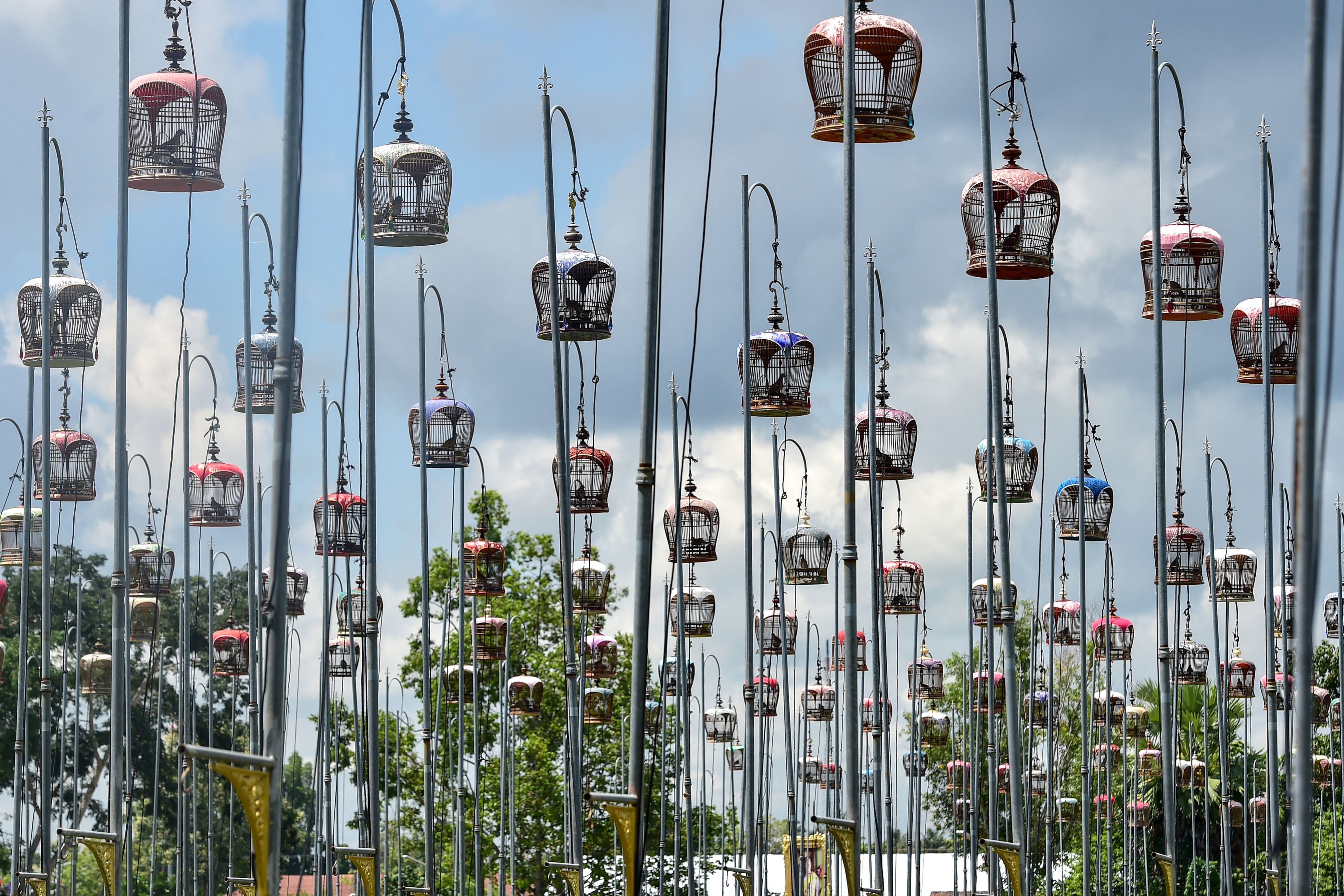 Birds sit in cages during a bird singing competition in Thailand's southern province of Narathiwat on September 25, 2024. Some 2,500 birds from Thailand, Malaysia and Singapore were entered in the annual contest. (Photo by Madaree Tohlala/AFP Photo)