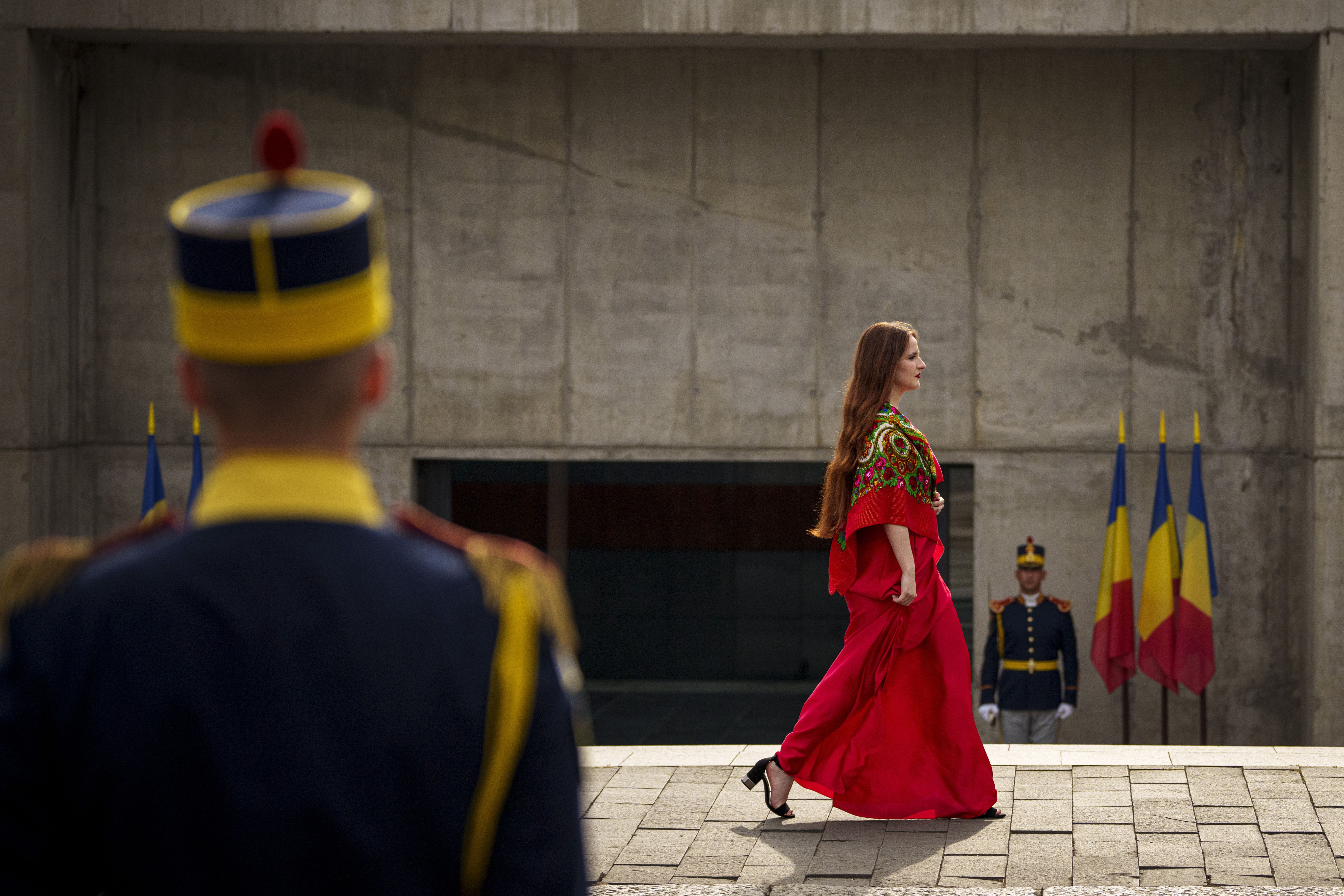 Romanian Roma soprano Isabela Stanescu walks by honor guard soldiers to perform the Romani anthem Gelem, Gelem during a commemoration of the Roma Holocaust Memorial Day, outside the Holocaust memorial, in Bucharest, Romania, Wednesday, August 2, 2023. (Photo by Andreea Alexandru/AP Photo)